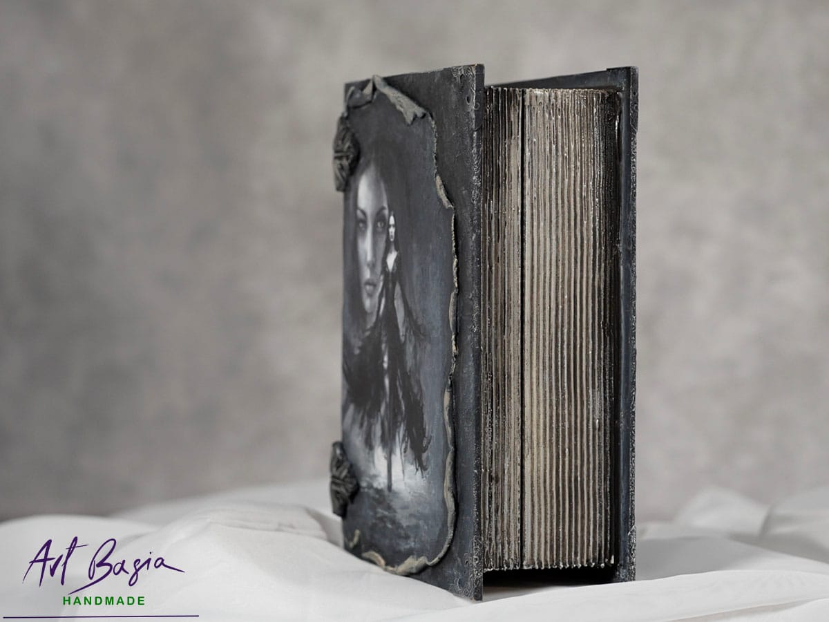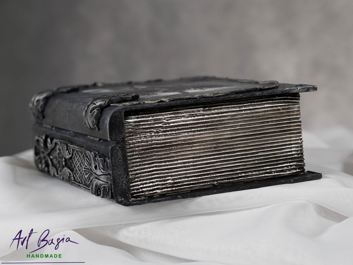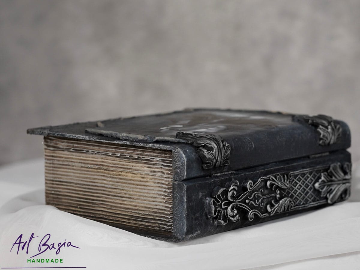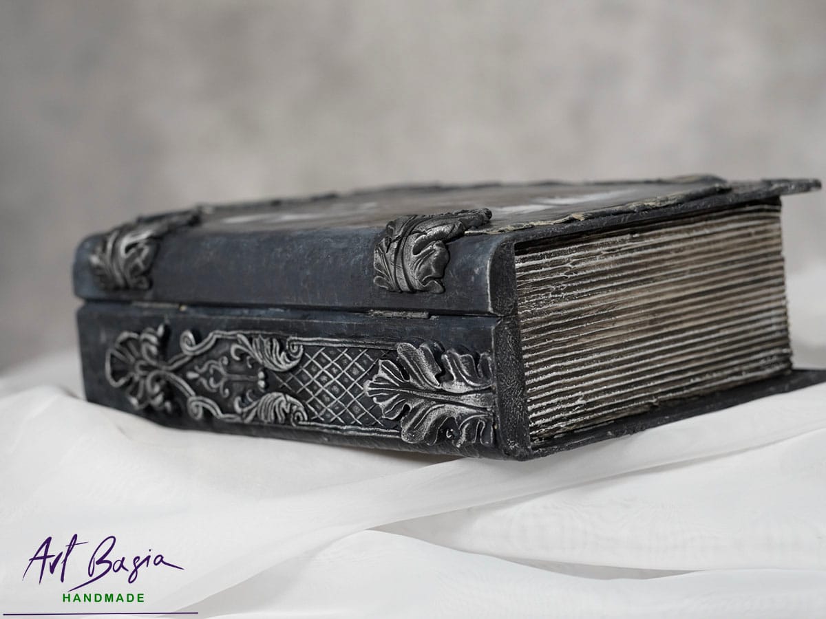 Zamknęłam ją w formie starej szkatułki – takiej, którą można by odnaleźć na dnie zapomnianej szuflady, w wieży starego domu albo w pracowni alchemika. Jej okładka jest ciężka, postarzana, z delikatnymi pęknięciami czasu. Ornamenty na grzbiecie i narożnikach powstały z wycisków z gliny samoutwardzalnej – jakby były fragmentami dawnej, rzeźbionej oprawy.