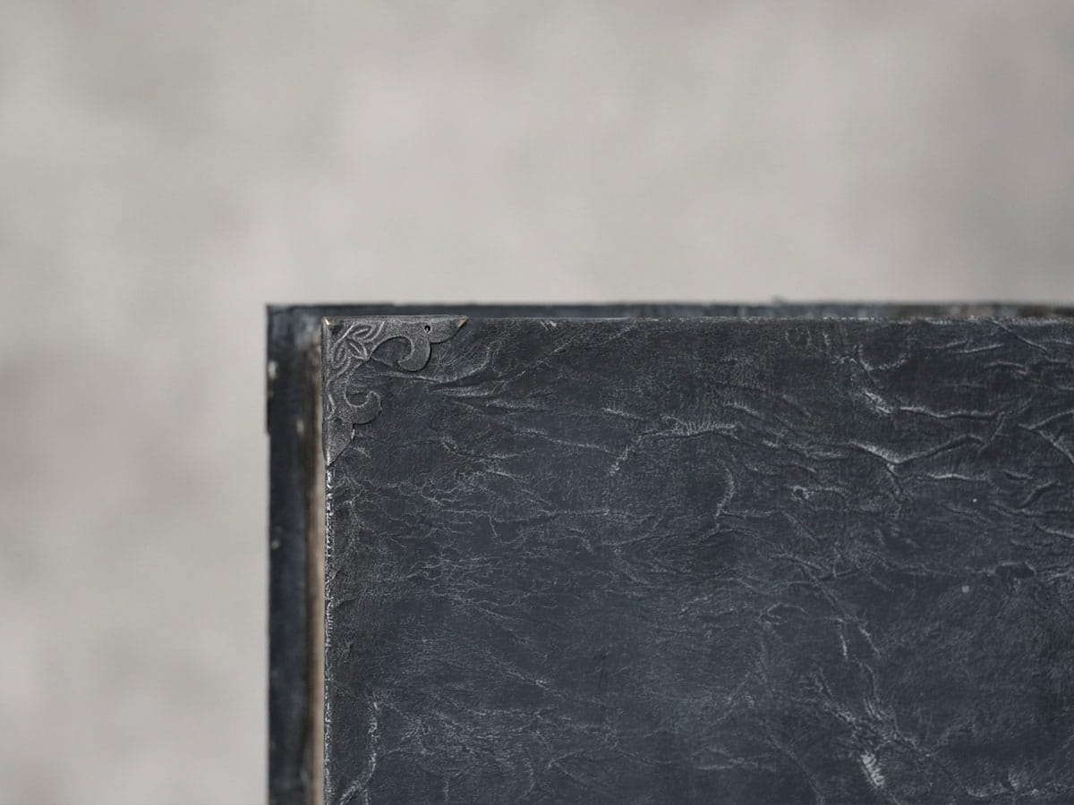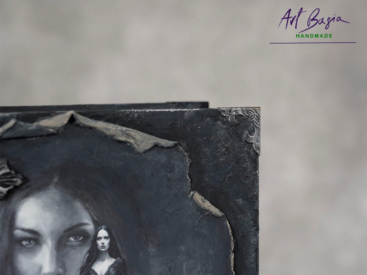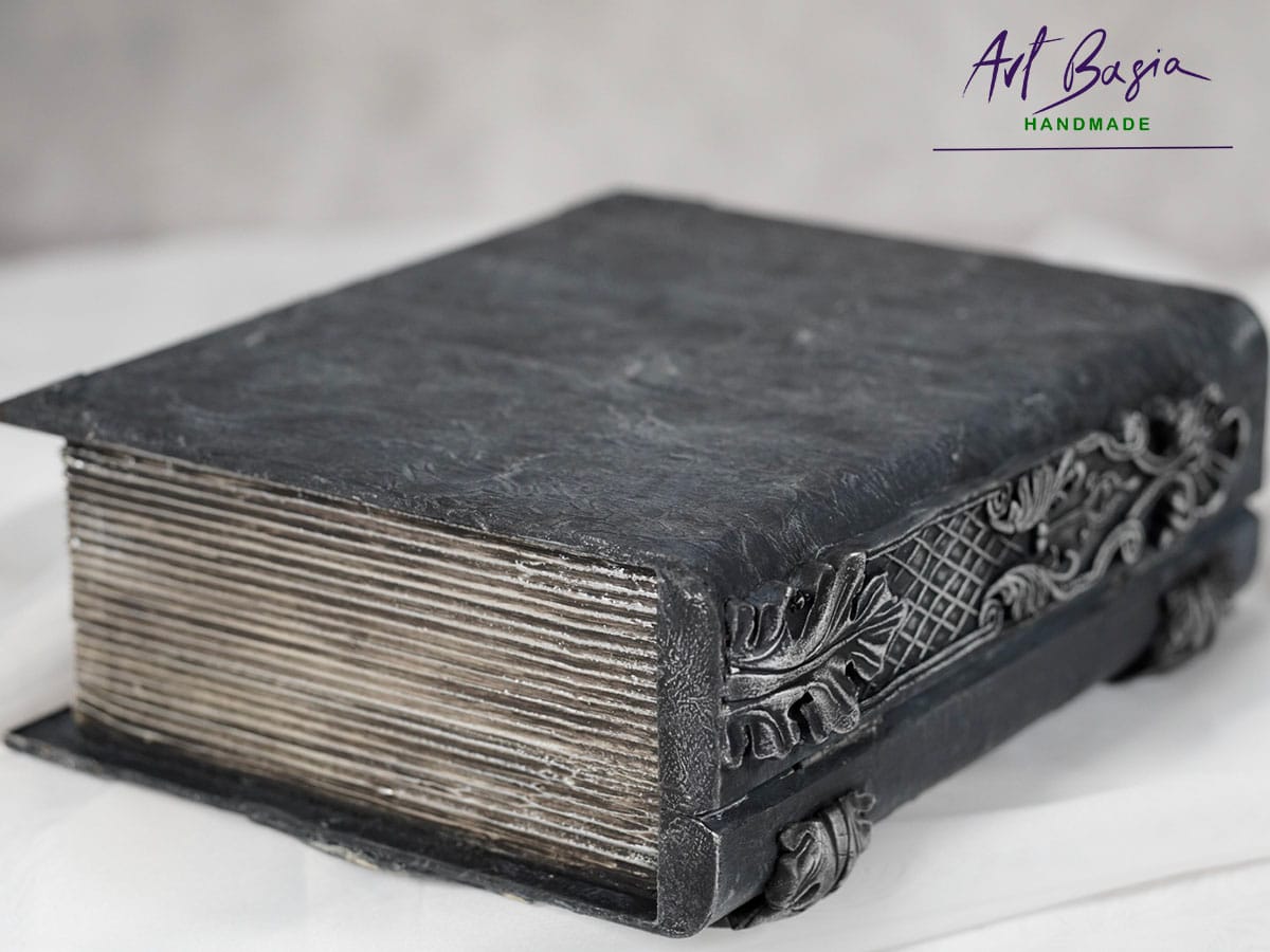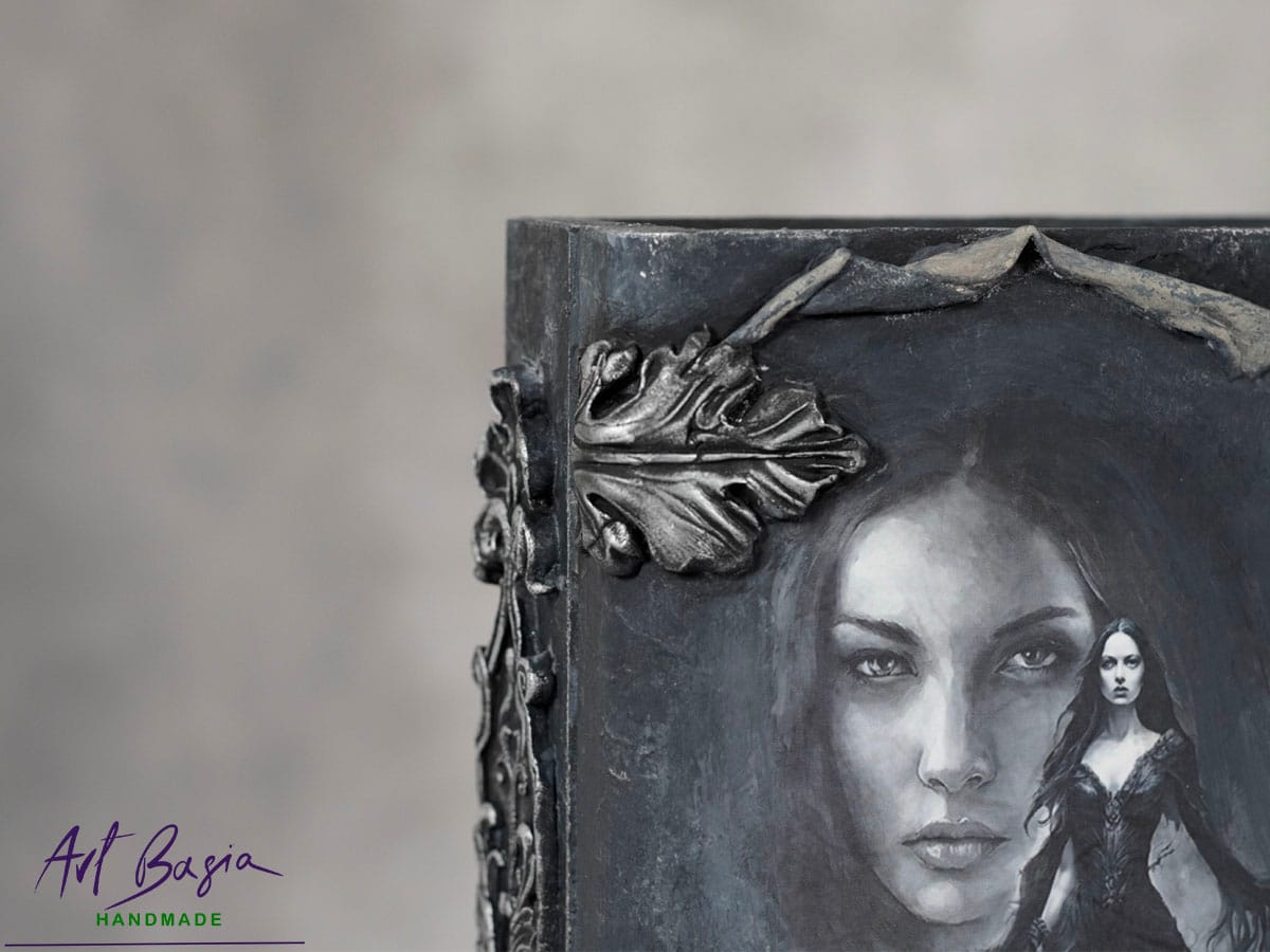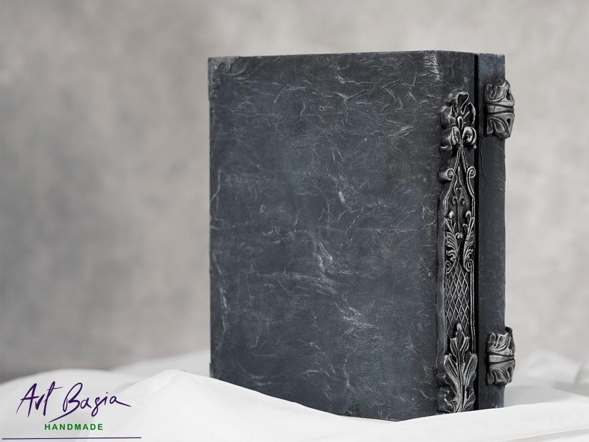 Zamknęłam ją w formie starej szkatułki – takiej, którą można by odnaleźć na dnie zapomnianej szuflady, w wieży starego domu albo w pracowni alchemika. Jej okładka jest ciężka, postarzana, z delikatnymi pęknięciami czasu. Ornamenty na grzbiecie i narożnikach powstały z wycisków z gliny samoutwardzalnej – jakby były fragmentami dawnej, rzeźbionej oprawy.