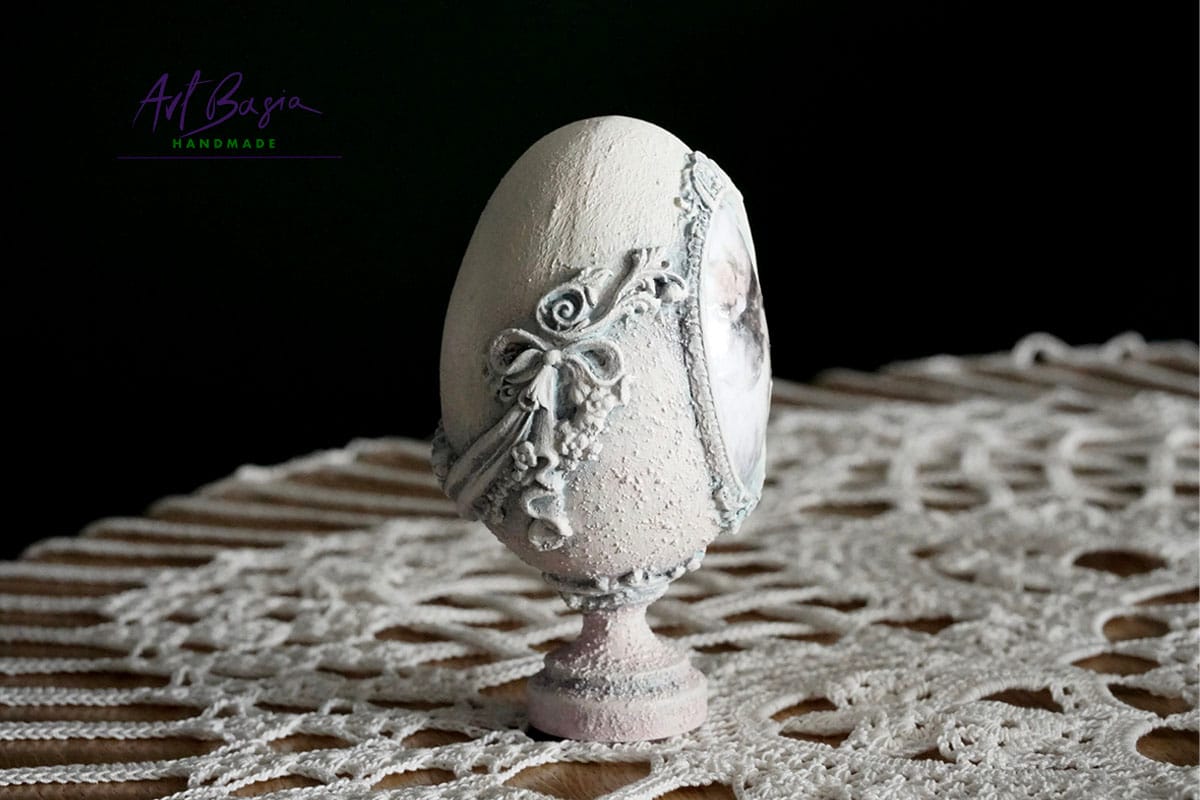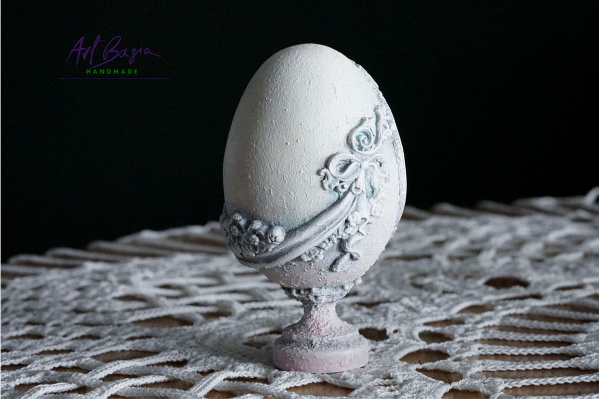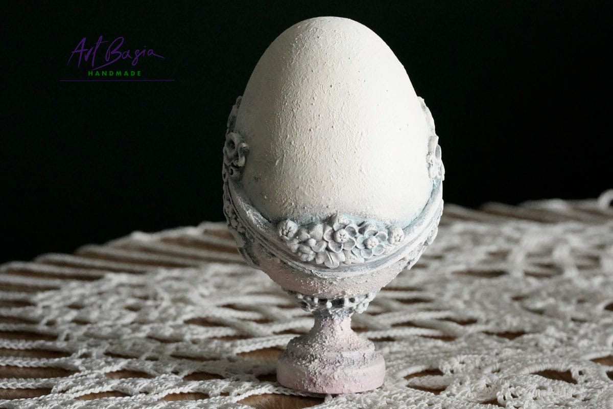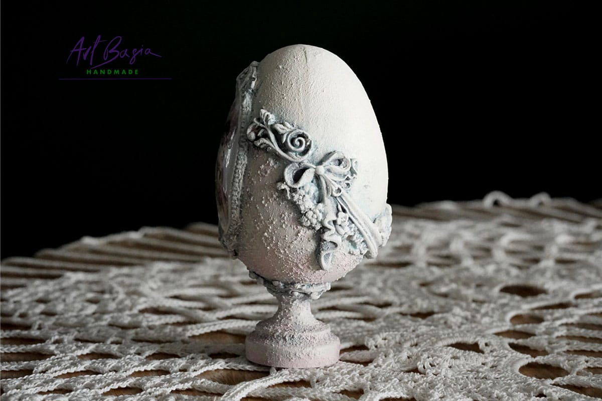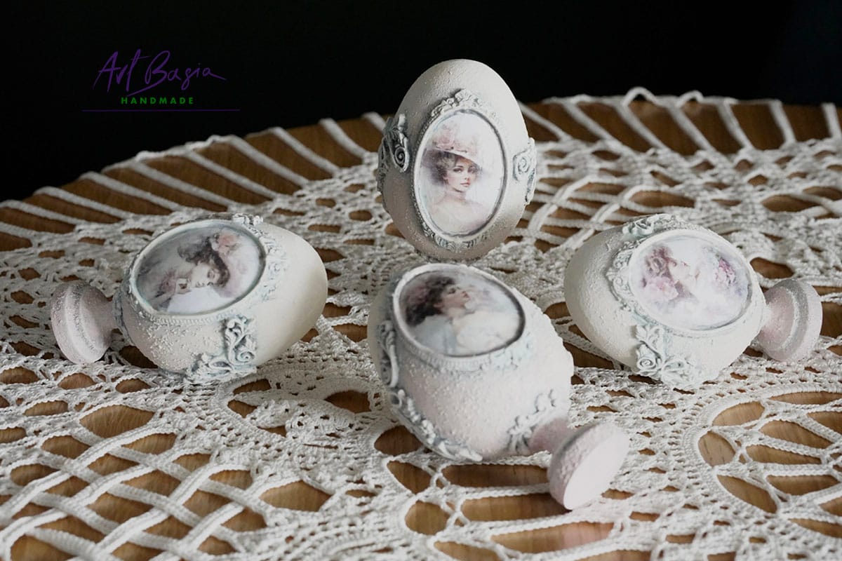 Każde jajeczko ma 11 cm wysokości oraz 3 cm nóżkę, dzięki czemu zyskuje elegancką, niemal pałacową formę. Bazą były plastikowe jajka, które ozdobiłam z zewnątrz, nadając im zupełnie nowy, szlachetny charakter.