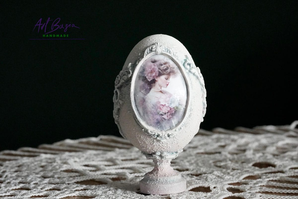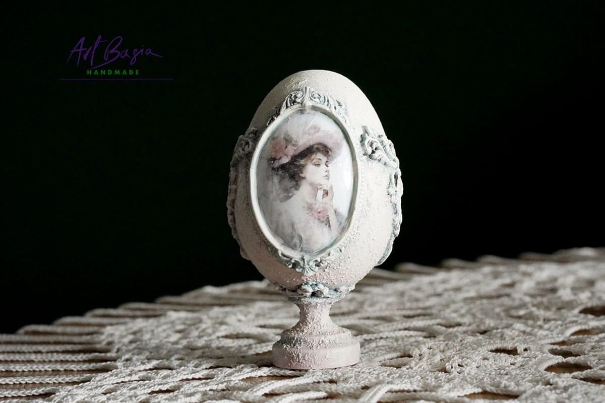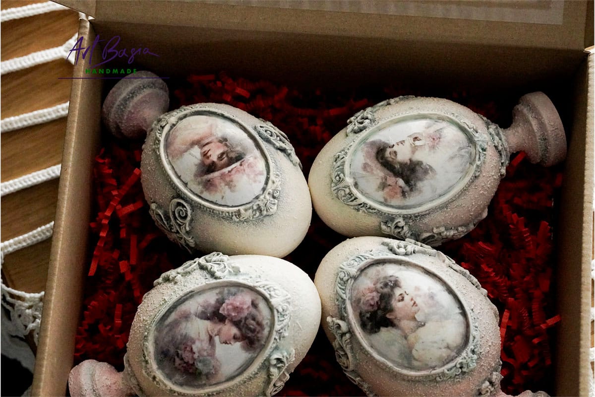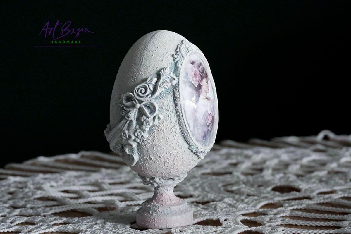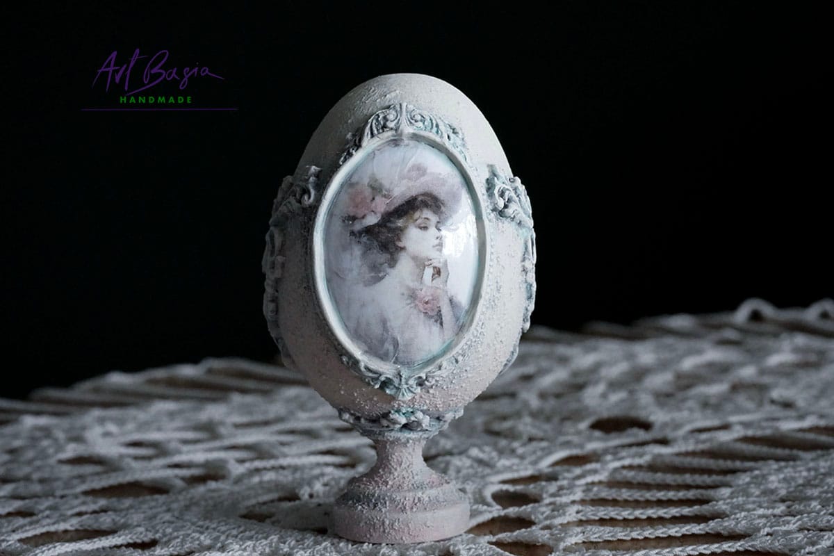 Każde jajeczko ma 11 cm wysokości oraz 3 cm nóżkę, dzięki czemu zyskuje elegancką, niemal pałacową formę. Bazą były plastikowe jajka, które ozdobiłam z zewnątrz, nadając im zupełnie nowy, szlachetny charakter.
