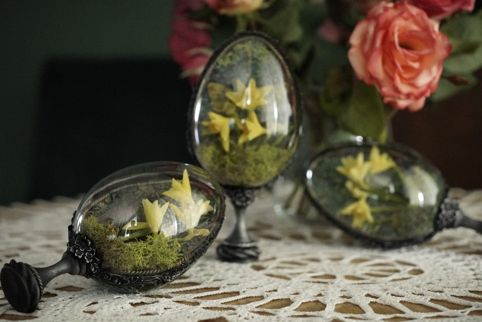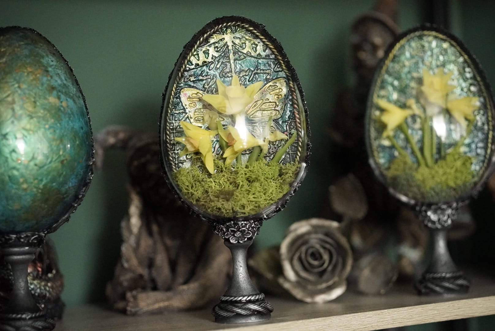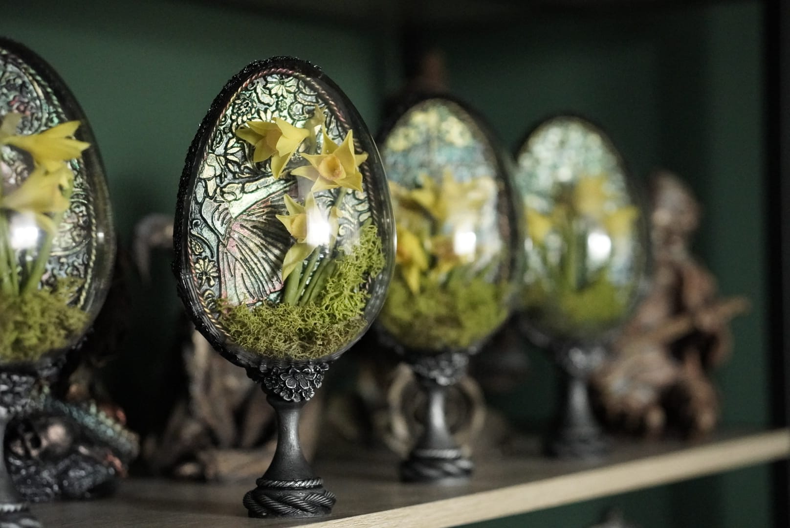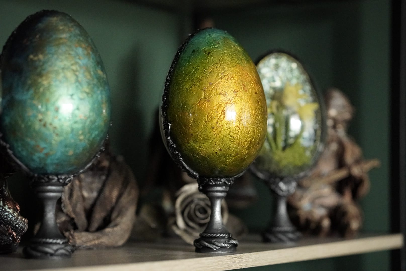 Bazą są przeźroczyste jajka akrylowe 16 cm, osadzone na dekoracyjnych podstawkach. Każde z nich jest inne, ale wszystkie łączy jedno – to małe, zamknięte światy.
