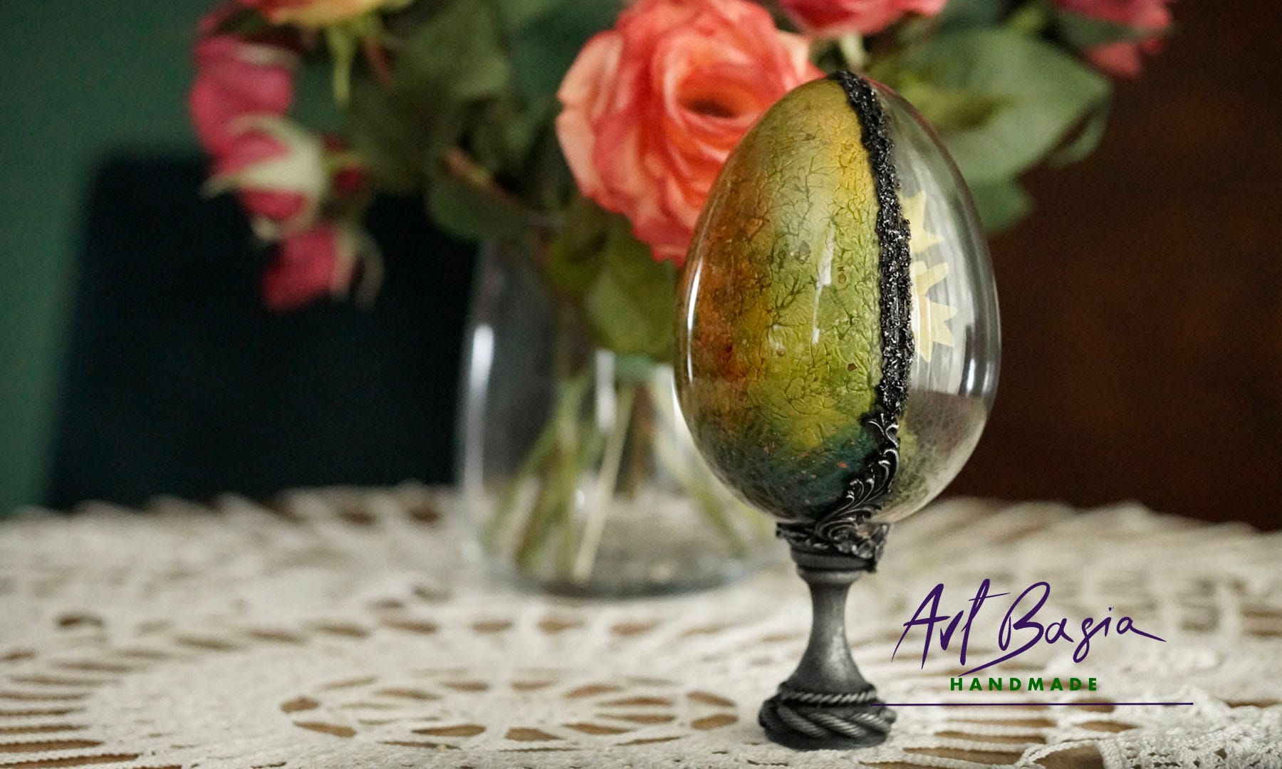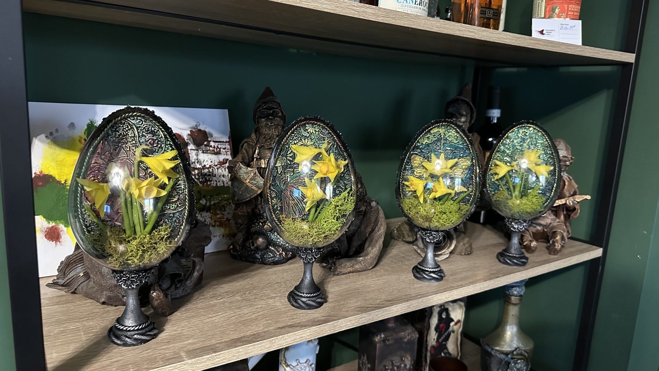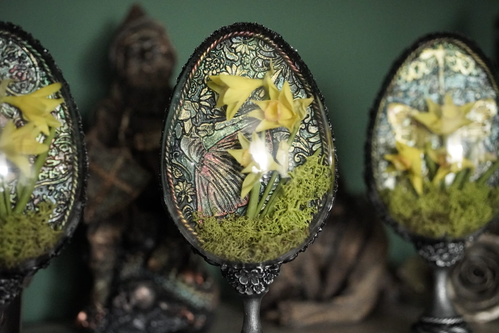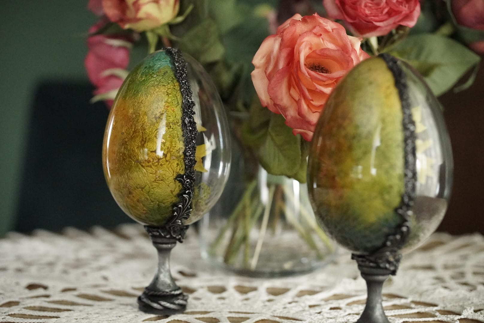 Bazą są przeźroczyste jajka akrylowe 16 cm, osadzone na dekoracyjnych podstawkach. Każde z nich jest inne, ale wszystkie łączy jedno – to małe, zamknięte światy.
