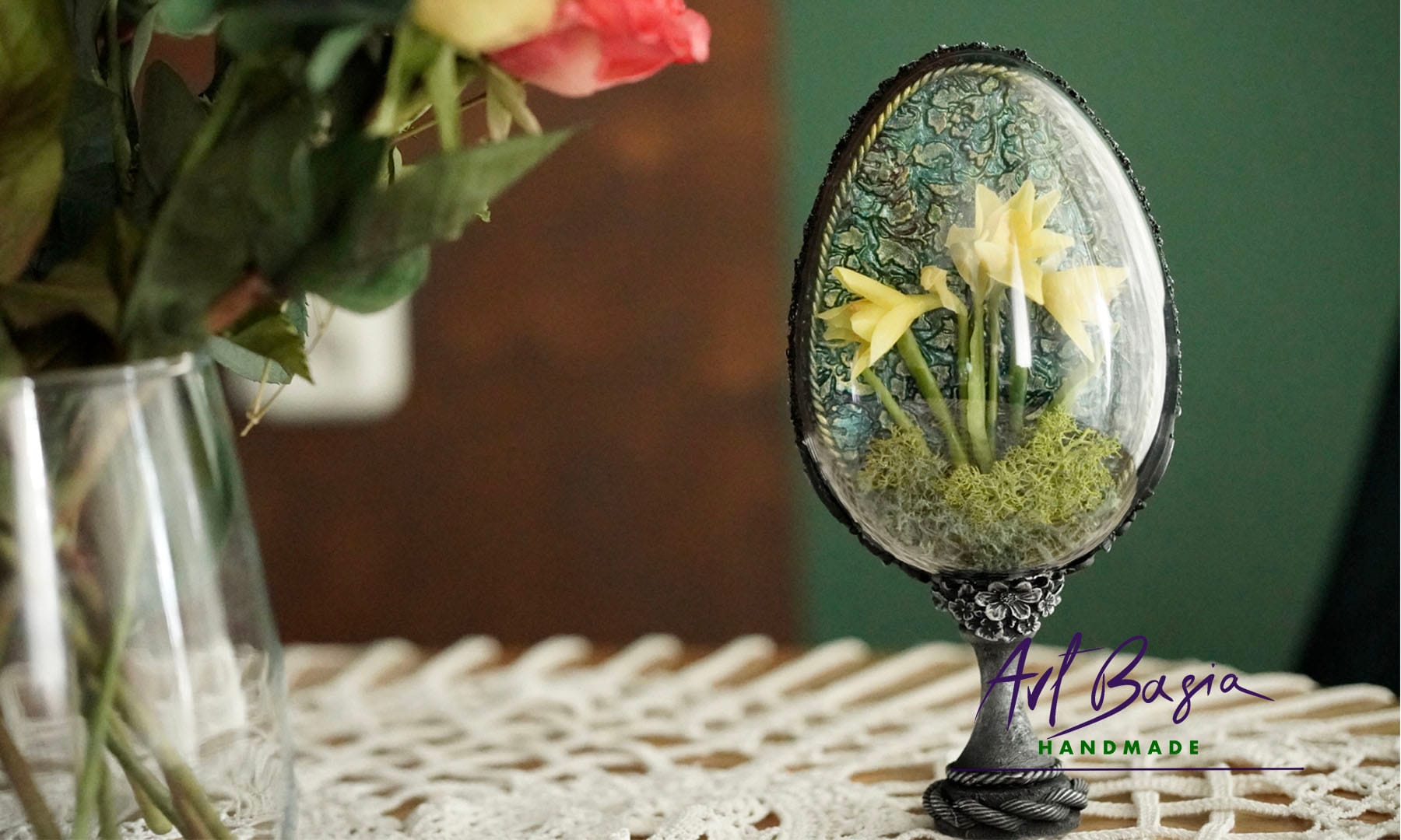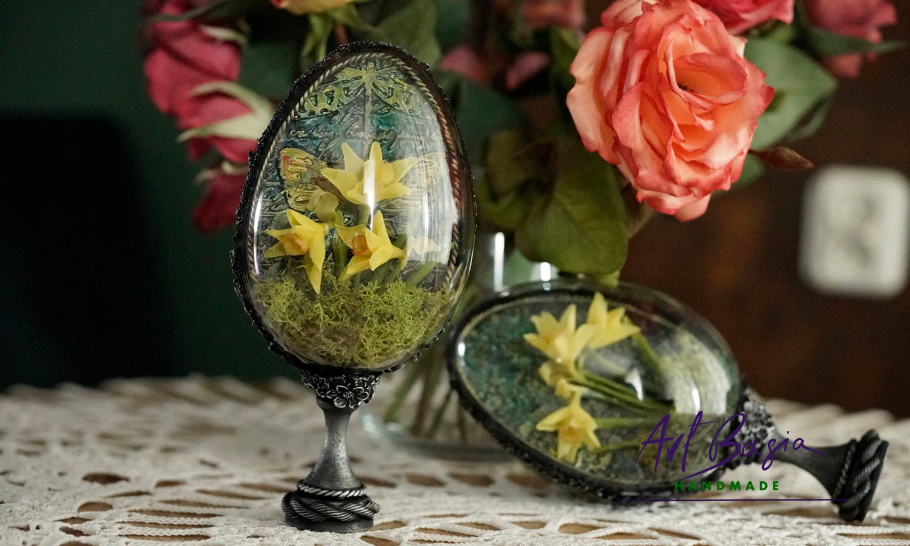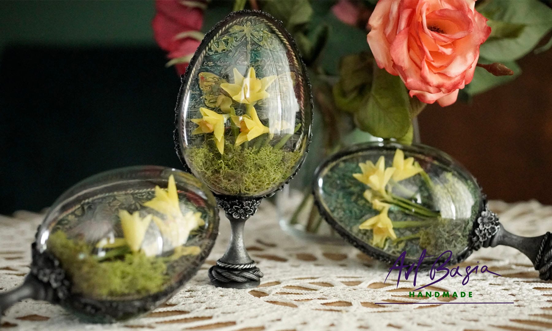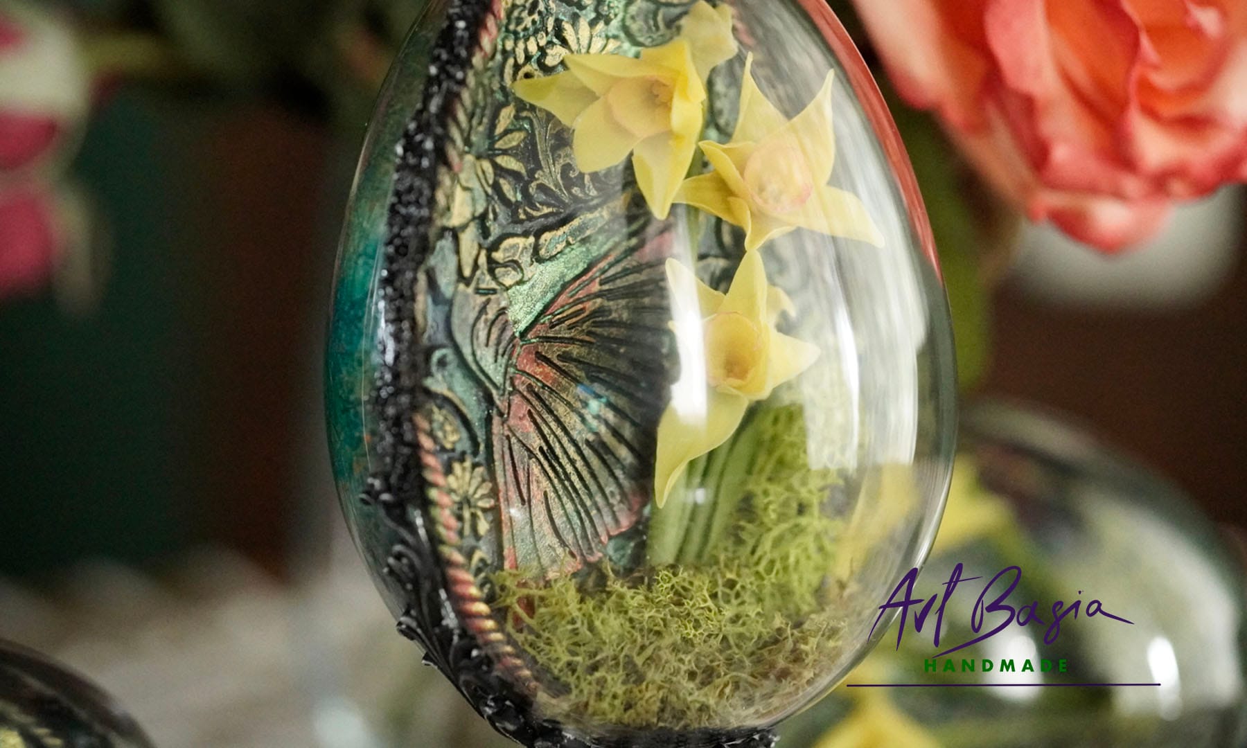 • Akrylowe jaja ArtBasia Handmade – zamknięte kompozycje z kwiatów, mchu i tuszy alkoholowych