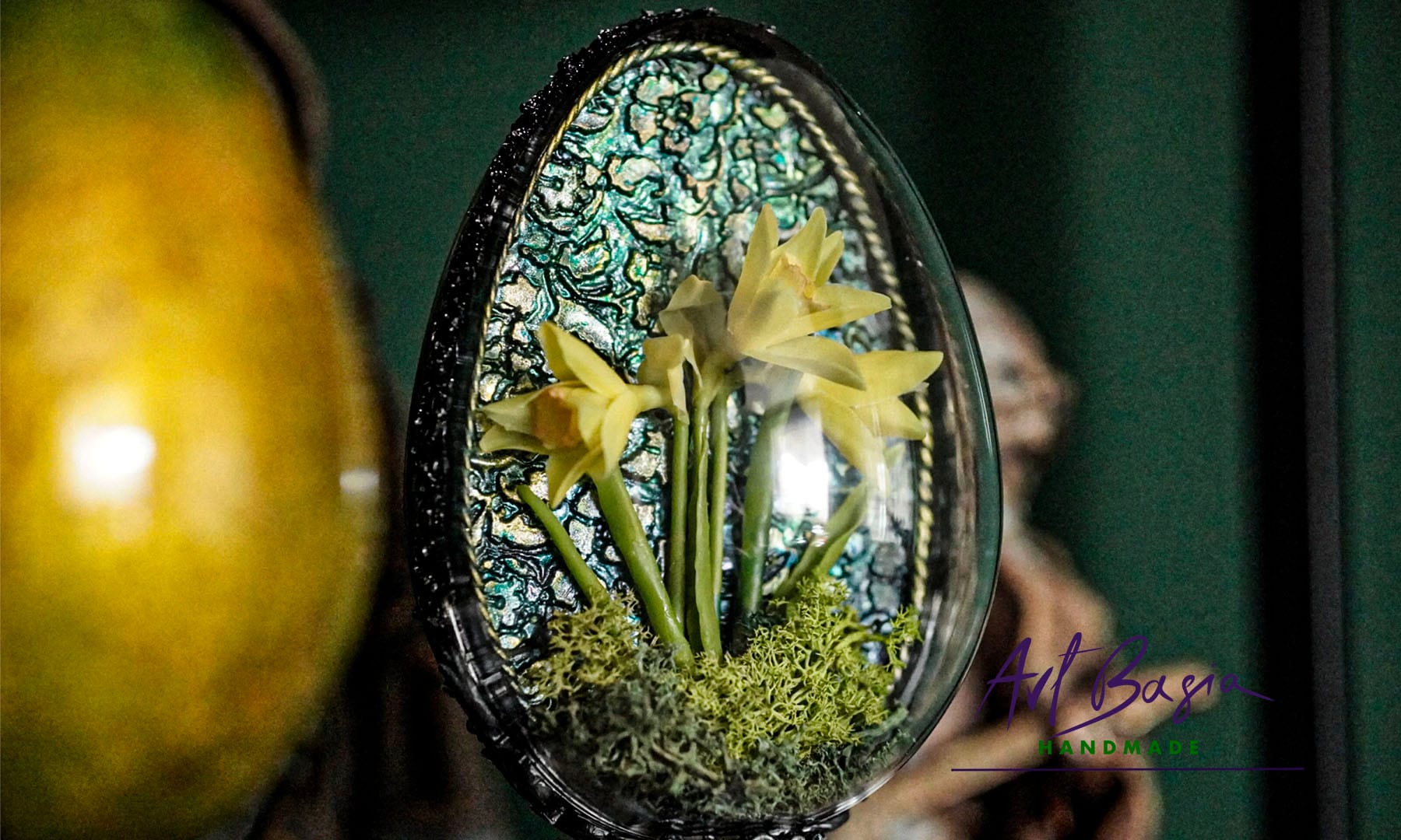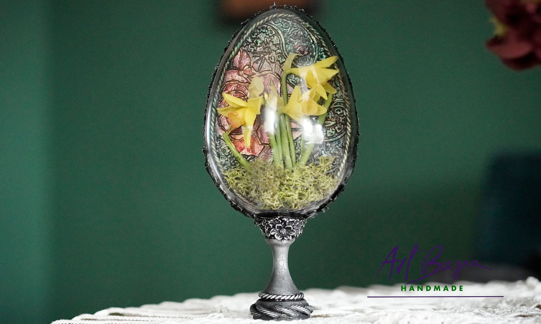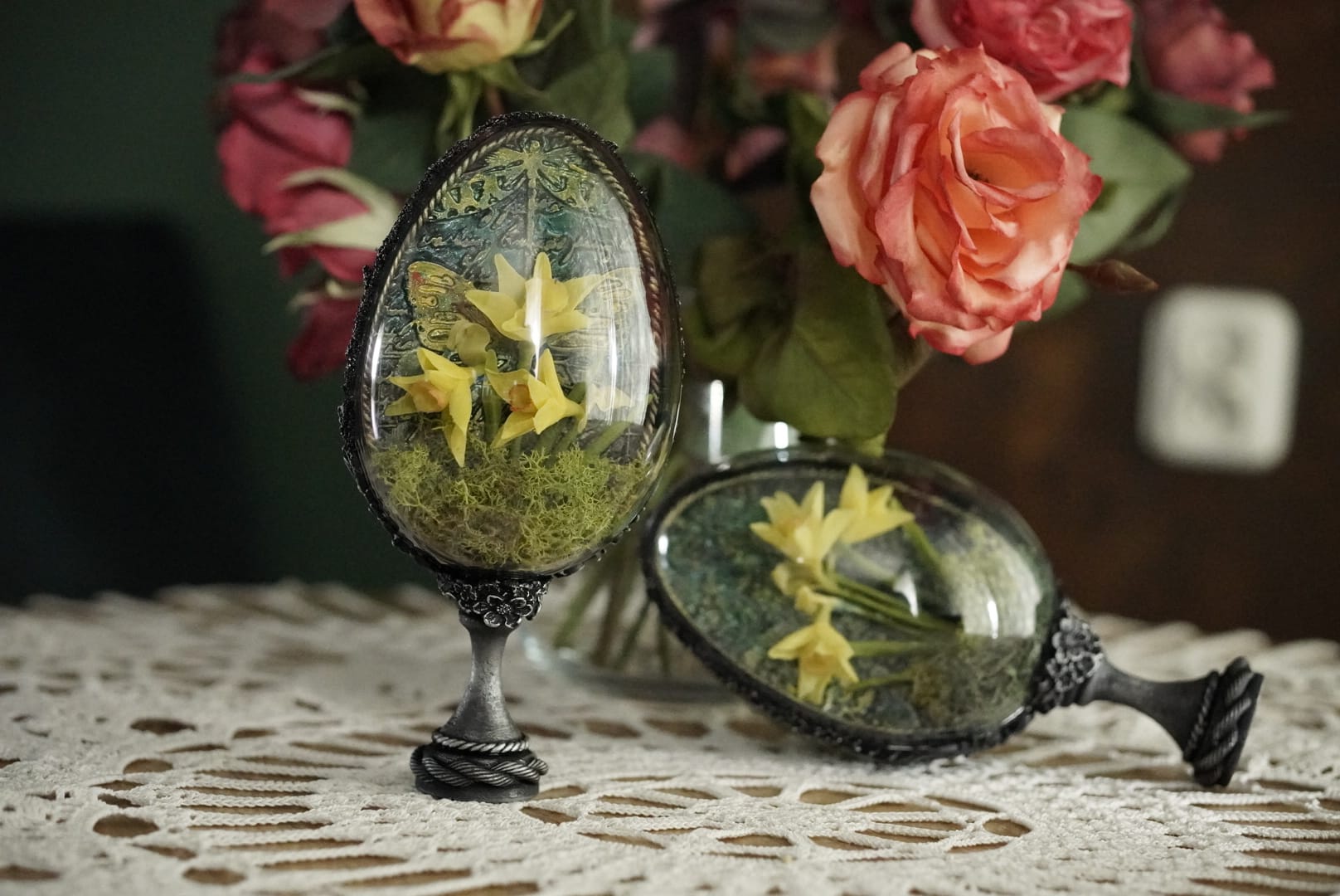 • Akrylowe jaja ArtBasia Handmade – zamknięte kompozycje z kwiatów, mchu i tuszy alkoholowych