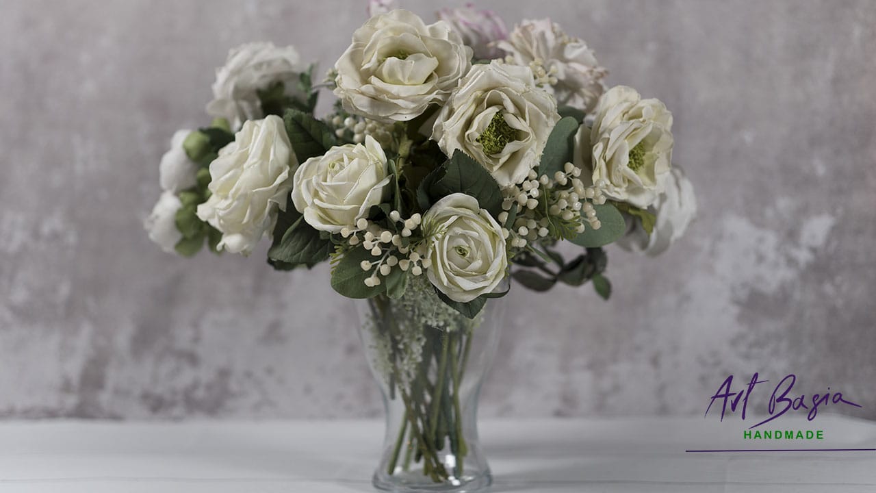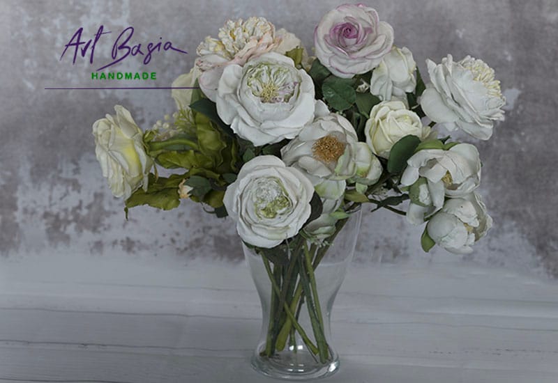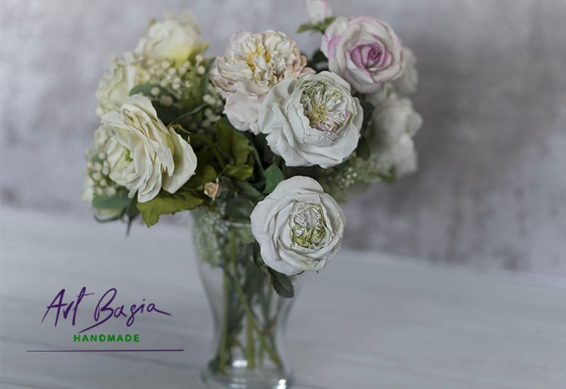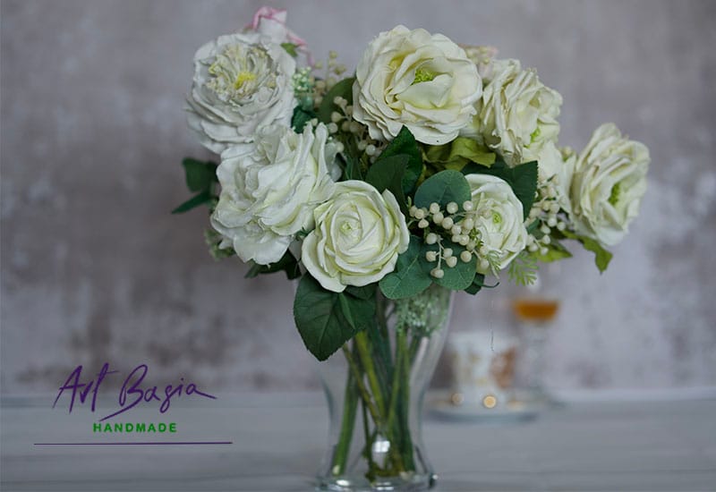 Ten bukiet inspirowany jest romantycznym, vintage’owym stylem. Delikatne odcienie bieli, kremu i subtelnego różu sprawiają, że idealnie komponuje się z eleganckimi aranżacjami wnętrz. Każdy element bukietu – od gęsto uformowanych płatków po realistycznie wyglądające liście – został wykonany ręcznie.