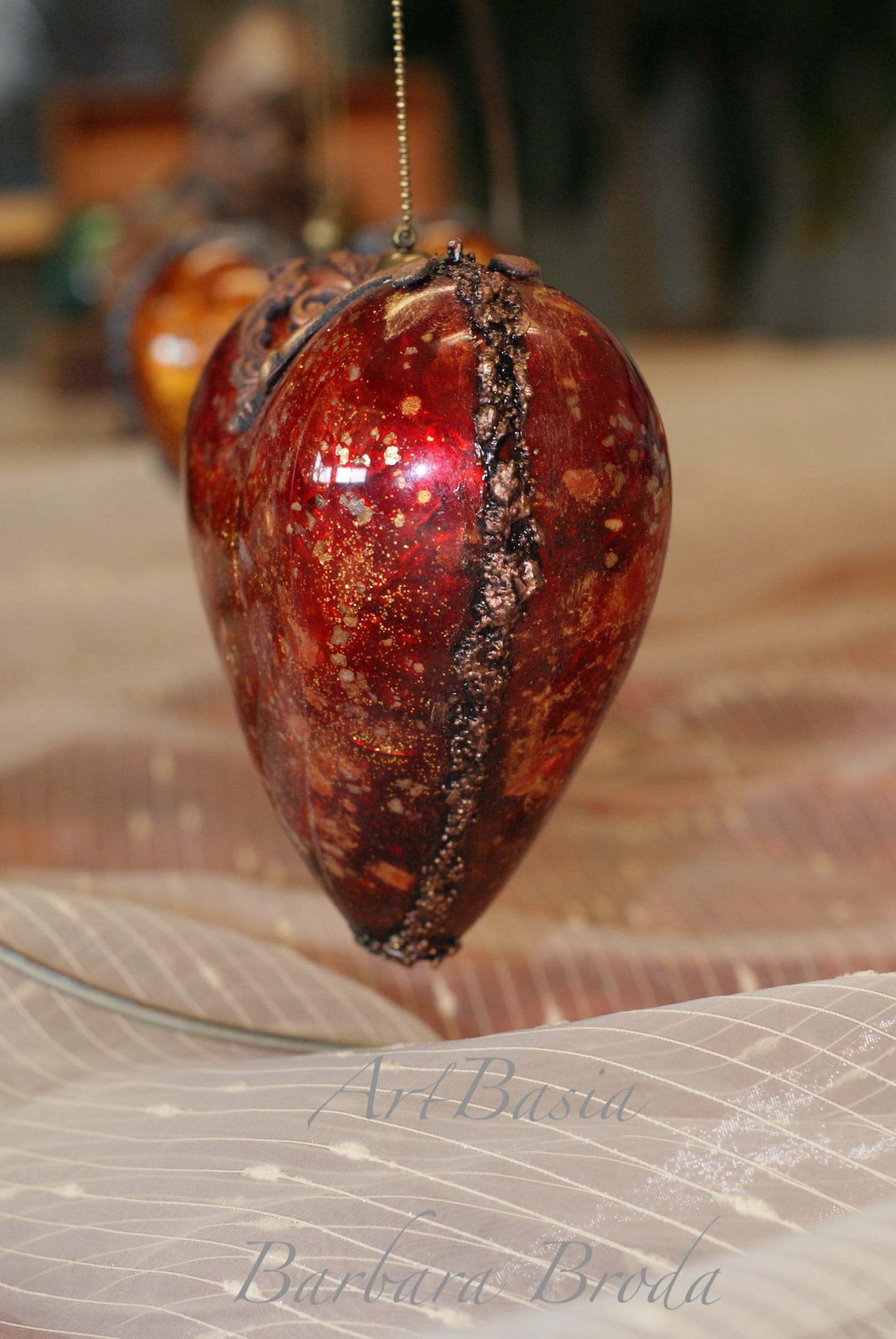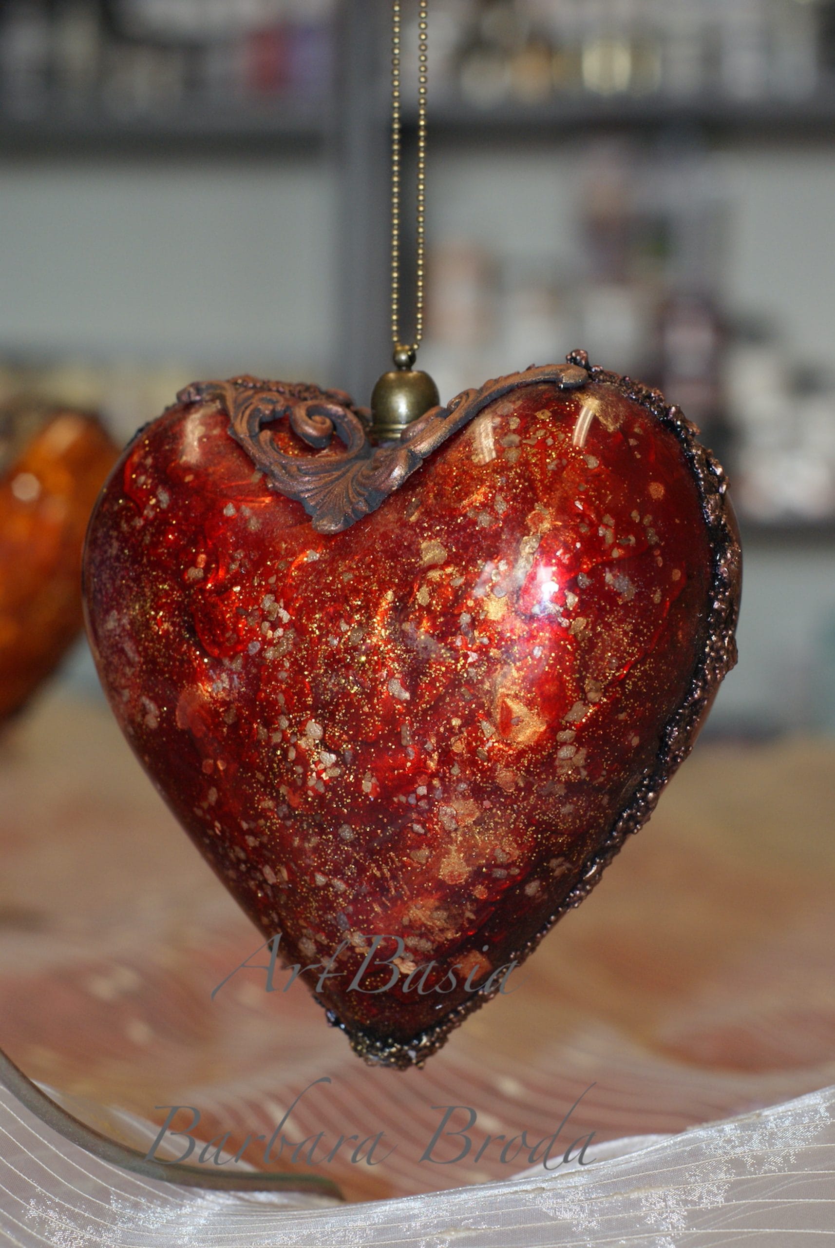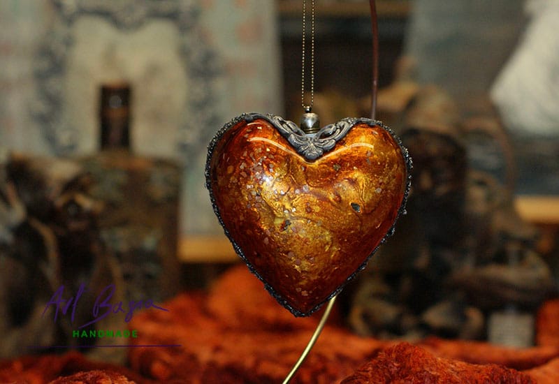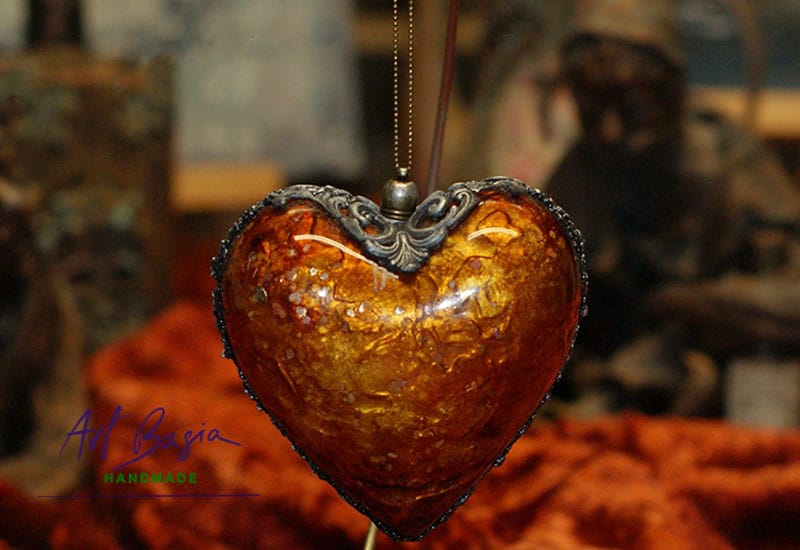 Każde serce zostało wykonane na akrylowej bazie, co nadaje mu lekkości i trwałości. Sekretem głębokich, bursztynowych odcieni jest zastosowanie tuszy alkoholowych, które pozwalają uzyskać efekt przenikających się kolorów i naturalnego światła zamkniętego w strukturze dekoracji.