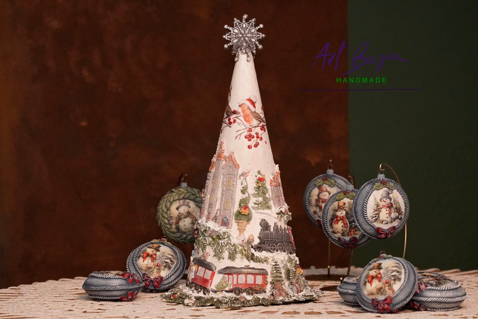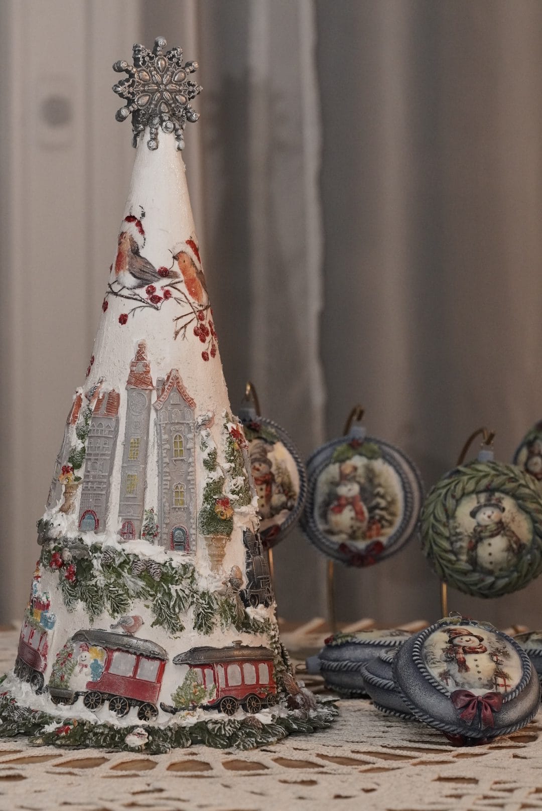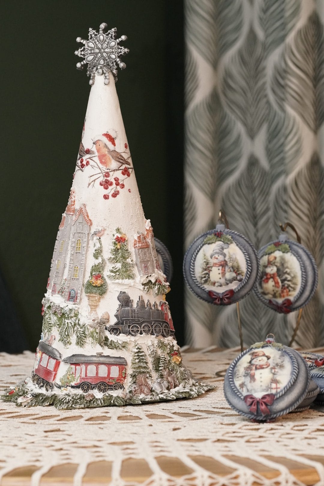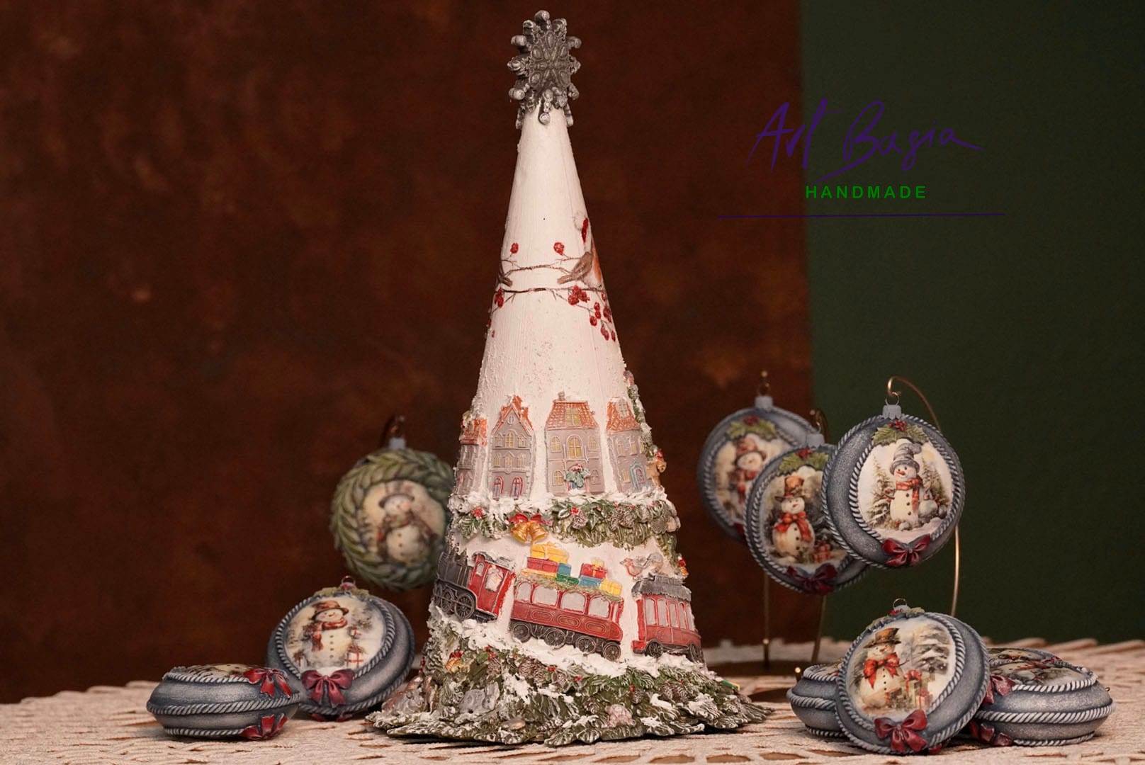 Do stworzenia tej choinki wykorzystano styropianowy stożek, który pokryto dekoracyjnymi elementami wykonanymi z masy samoutwardzalnej. Wzory powstały za pomocą foremek, a każdy z nich przedstawia urokliwe motywy świąteczne: budynki, lokomotywę z wagonikami, gałęzie ostrokrzewu oraz ptaki.