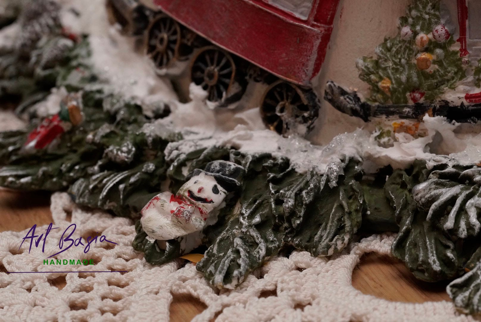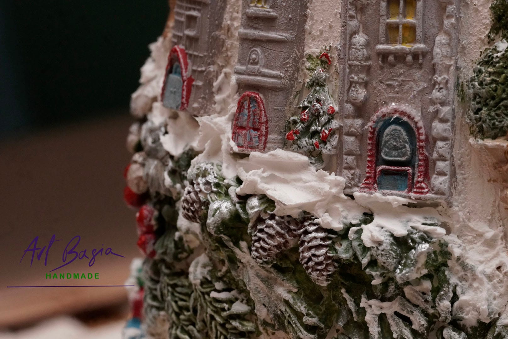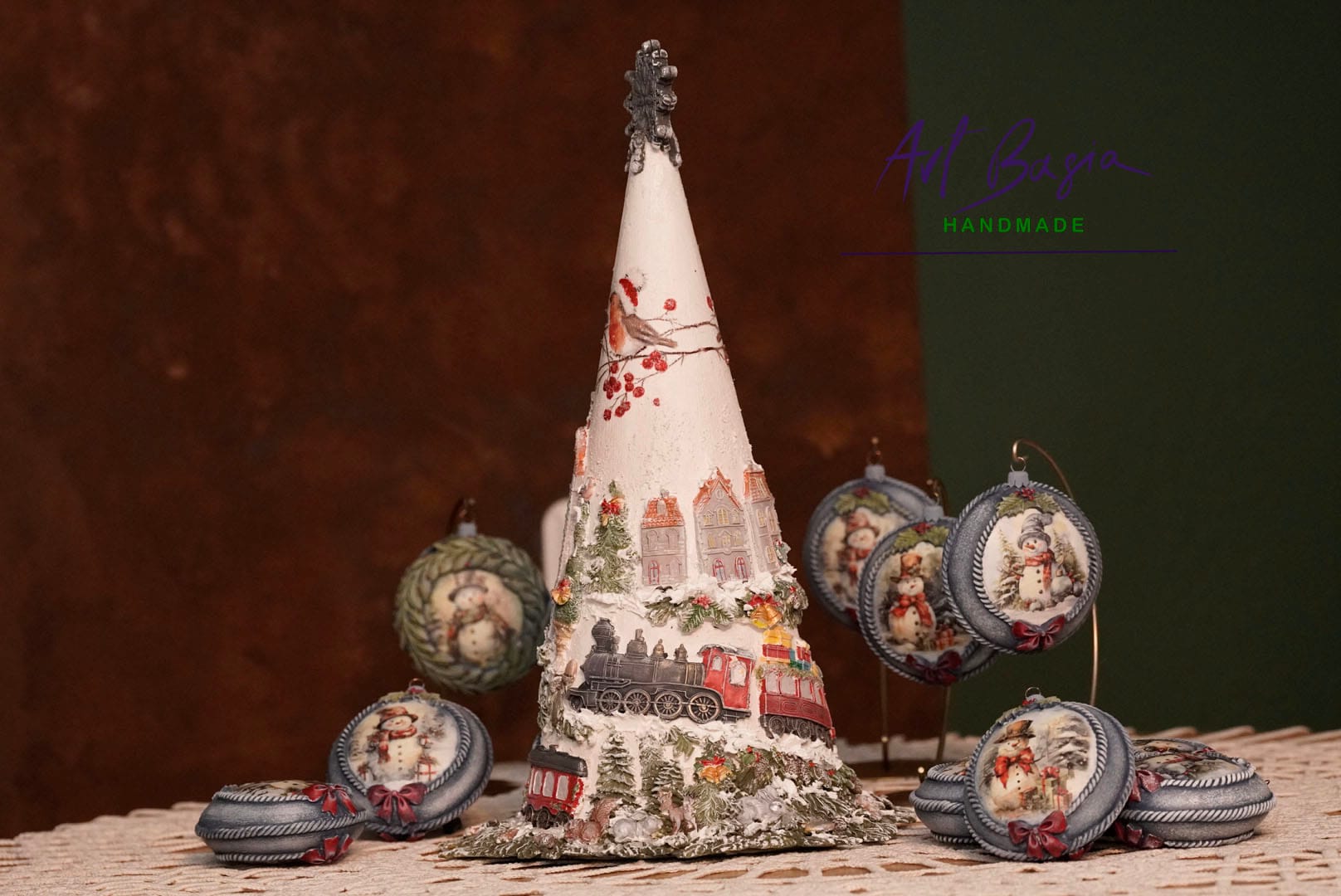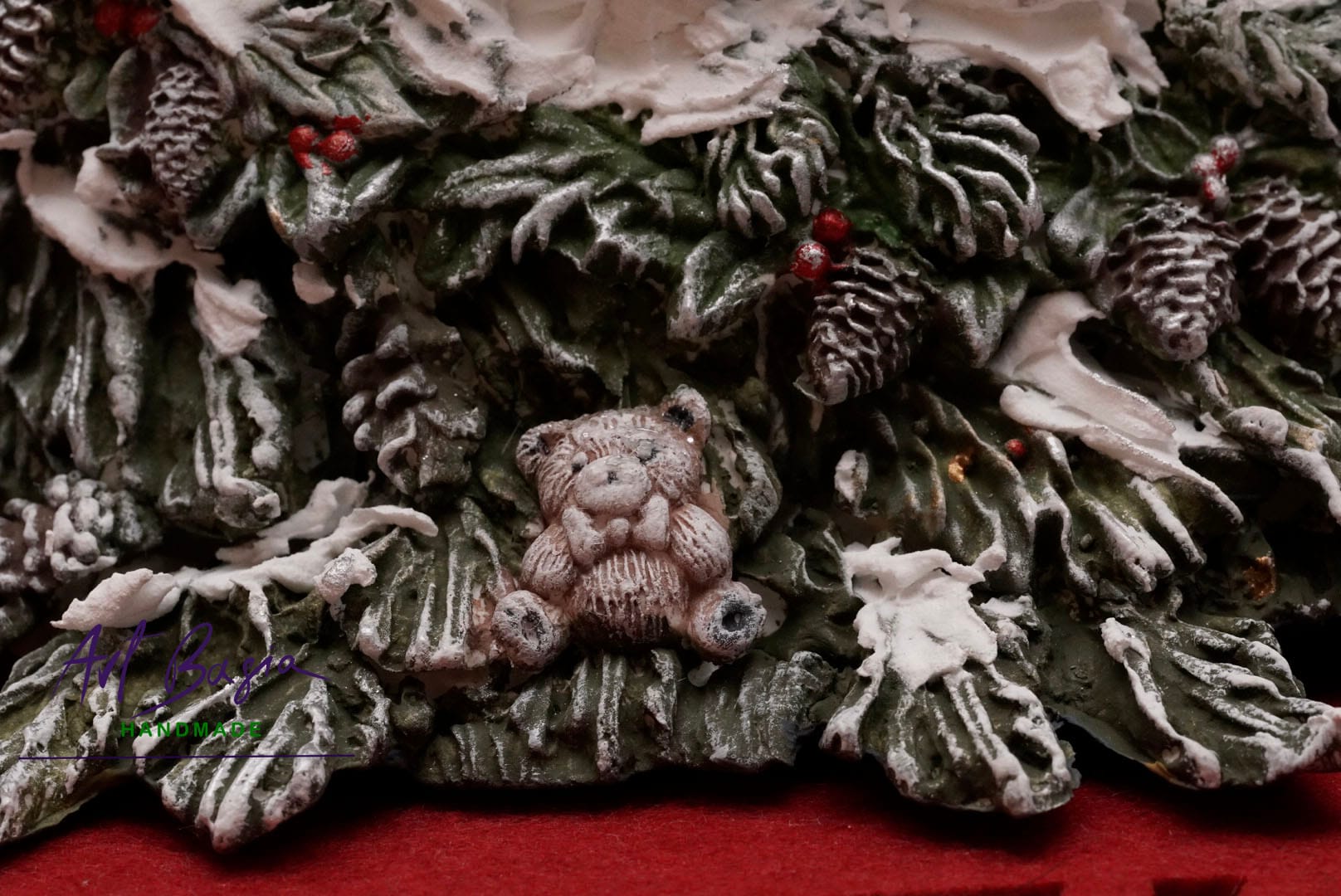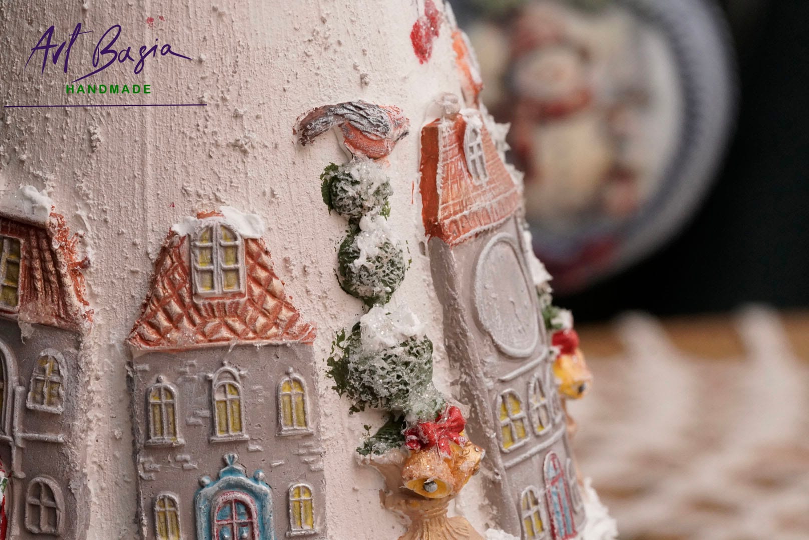 Do stworzenia tej choinki wykorzystano styropianowy stożek, który pokryto dekoracyjnymi elementami wykonanymi z masy samoutwardzalnej. Wzory powstały za pomocą foremek, a każdy z nich przedstawia urokliwe motywy świąteczne: budynki, lokomotywę z wagonikami, gałęzie ostrokrzewu oraz ptaki.