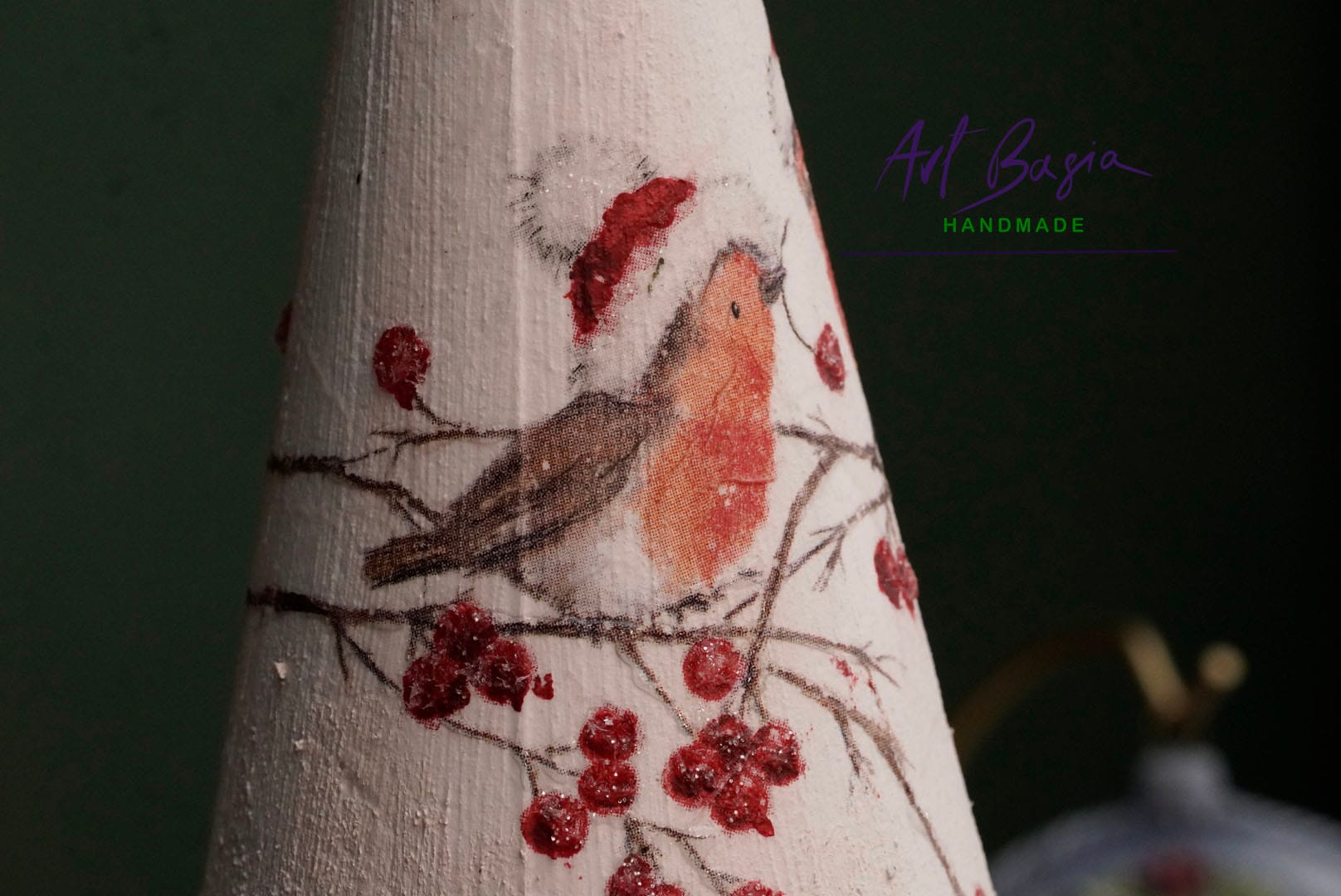 Górna część choinki zdobiona techniką decoupage, widzimy tu jarzębinowe gałęzie i ptaszki, wprowadza to lekkość i naturalny akcent.