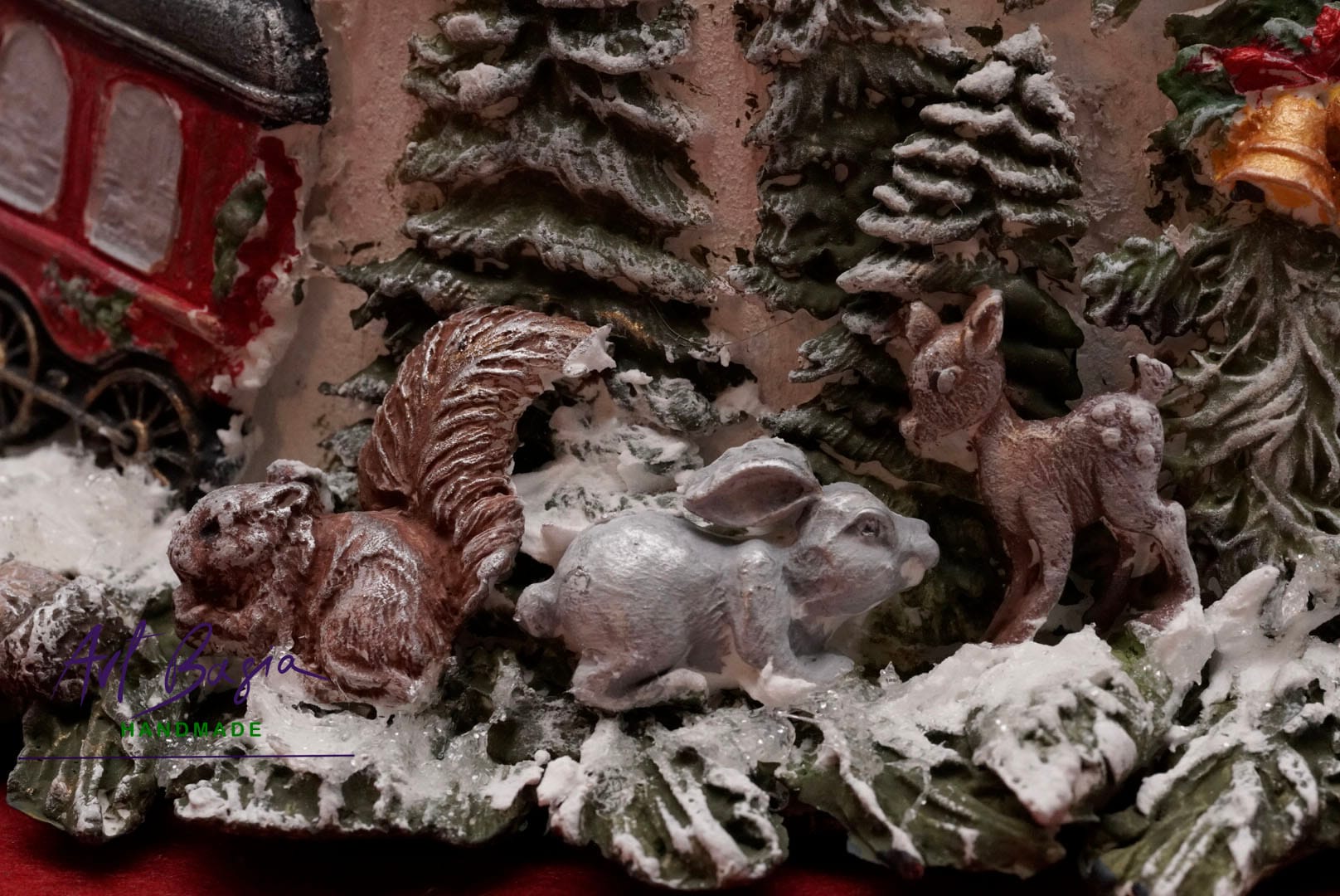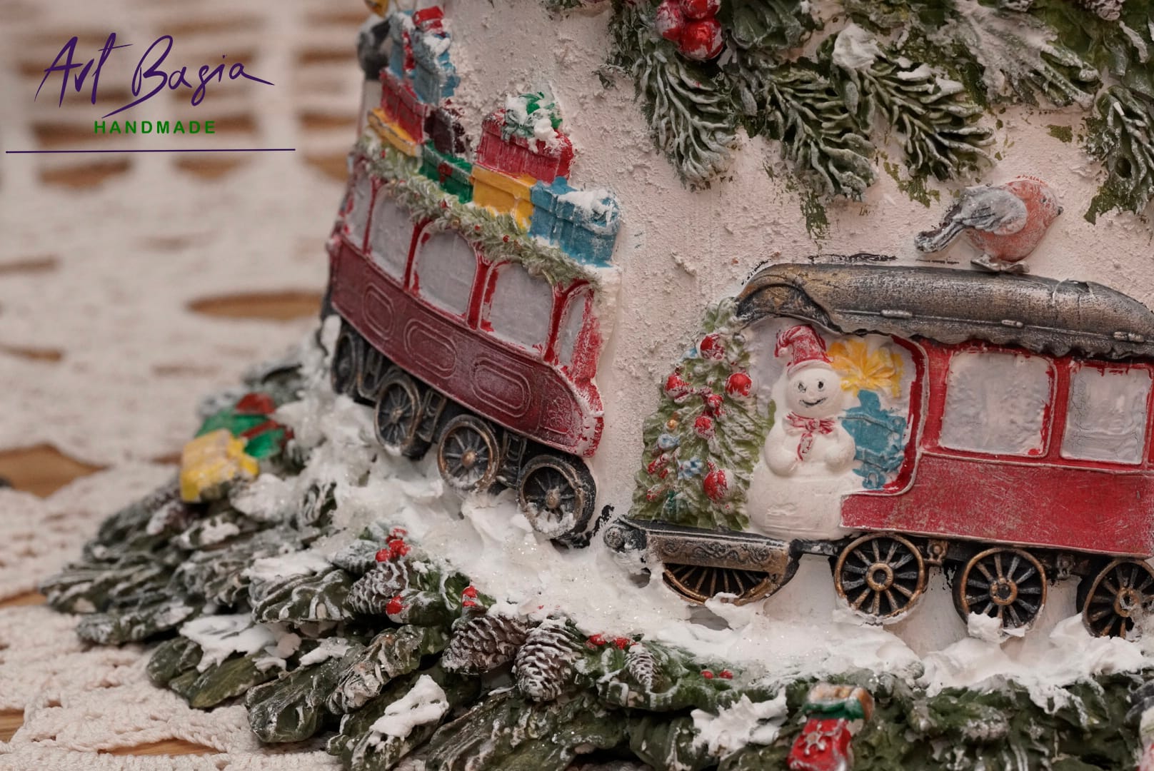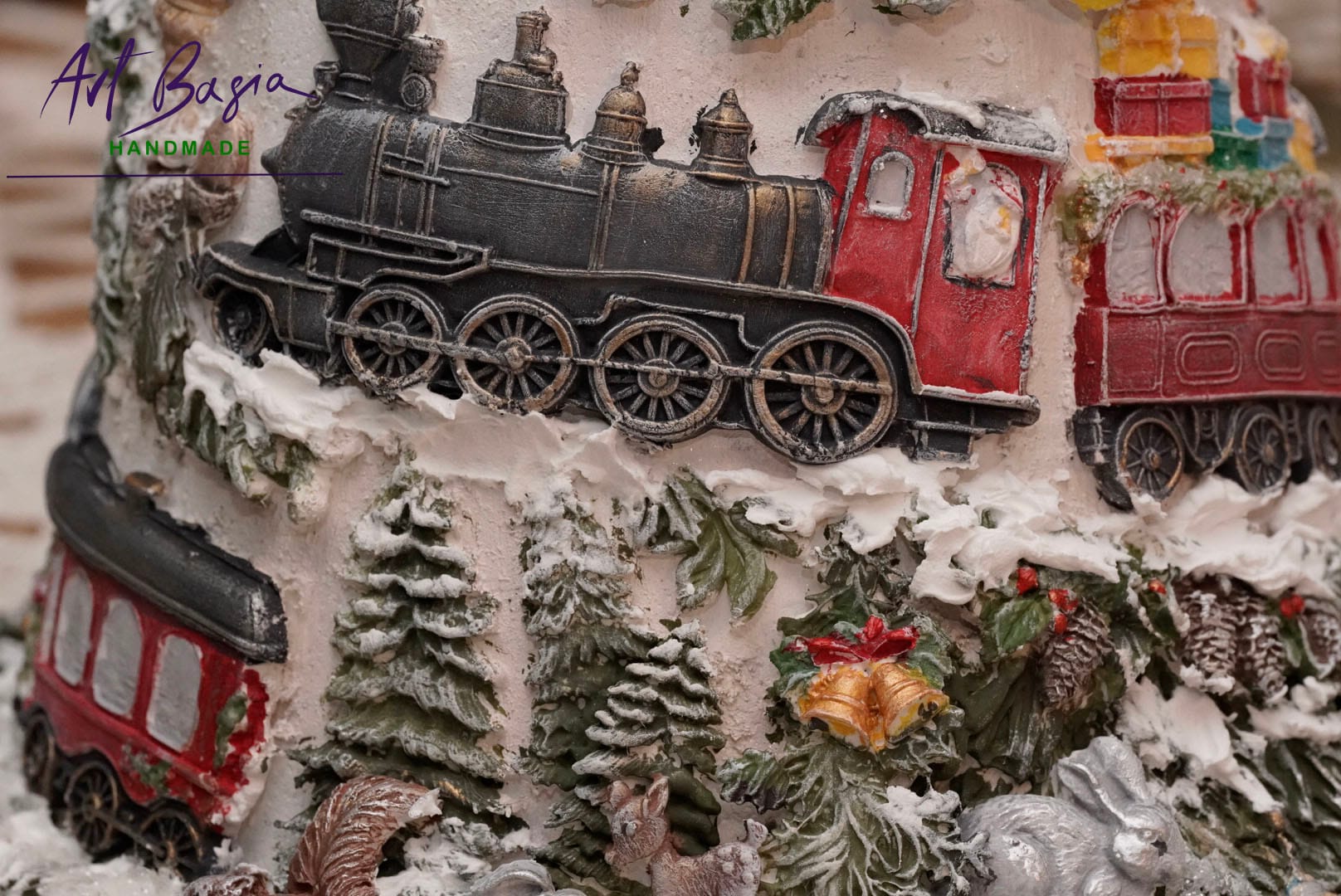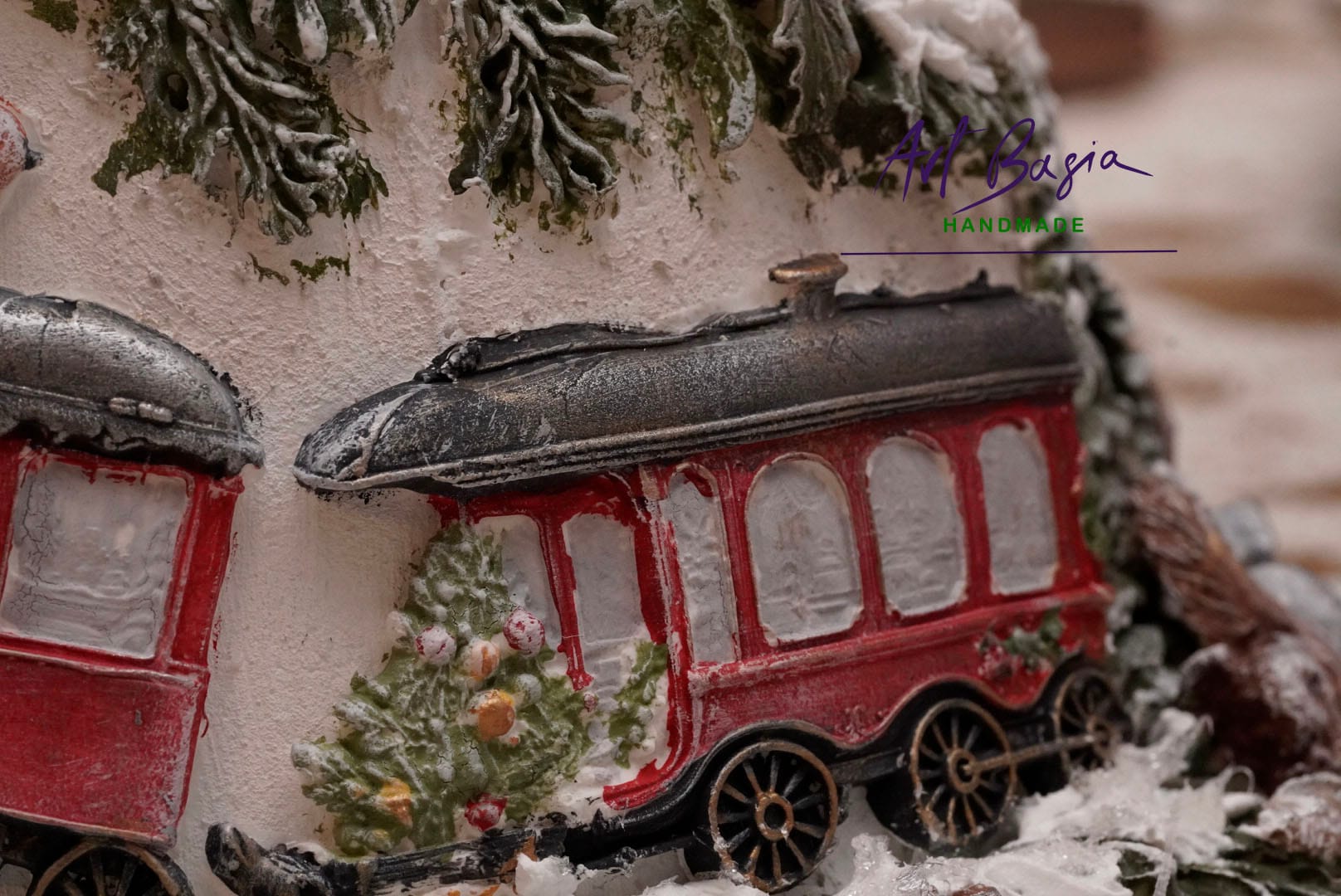 Na środkowym poziomie widnieje panorama miasteczka z malowniczymi kamienicami, a na najniższym poziomie znajduje się kolorowa lokomotywa z wagonami pełnymi prezentów.