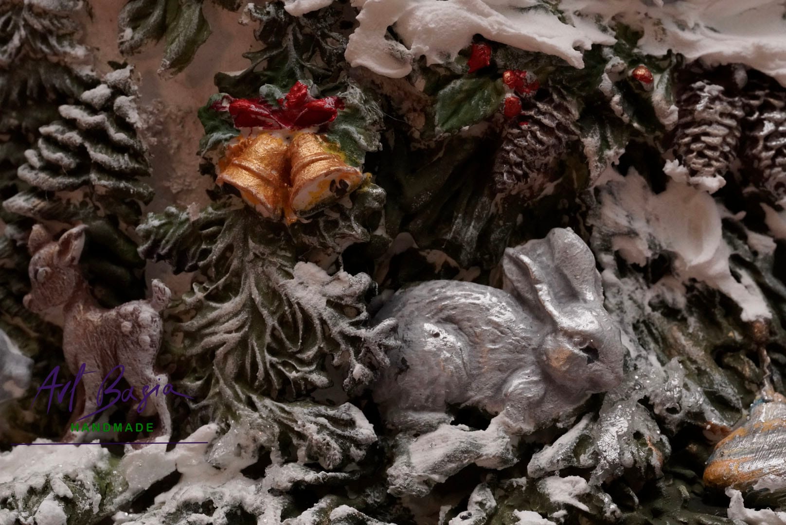Elementy zostały pomalowane farbami akrylowymi w klasycznych kolorach świątecznych – dominują biel, zieleń, czerwień, a także subtelne akcenty z metalicznym wykończeniem, które dodają elegancji.