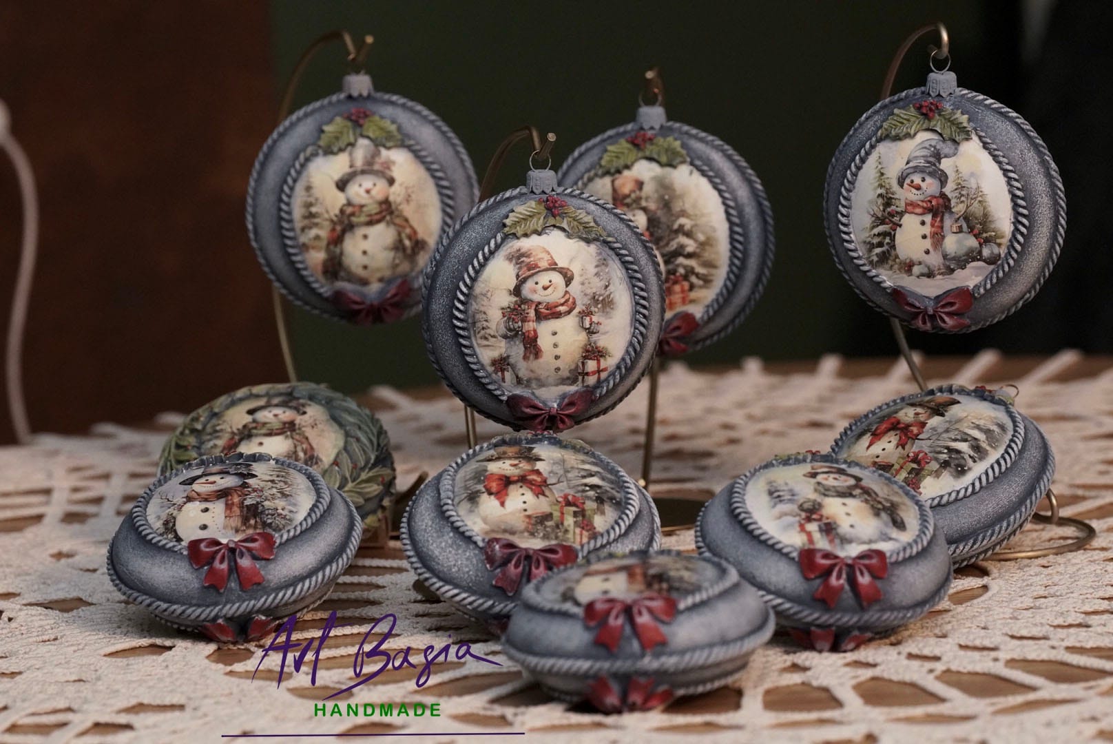 Obok choinki znalazły się ręcznie wykonane bombki w tonacji biało-niebieskiej, zdobione zimowymi scenkami z bałwankami. Każda bombka jest starannie wykończona wstęgami i drobnymi detalami, co idealnie komponuje się z całością.