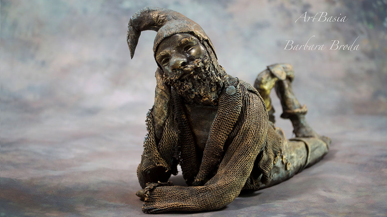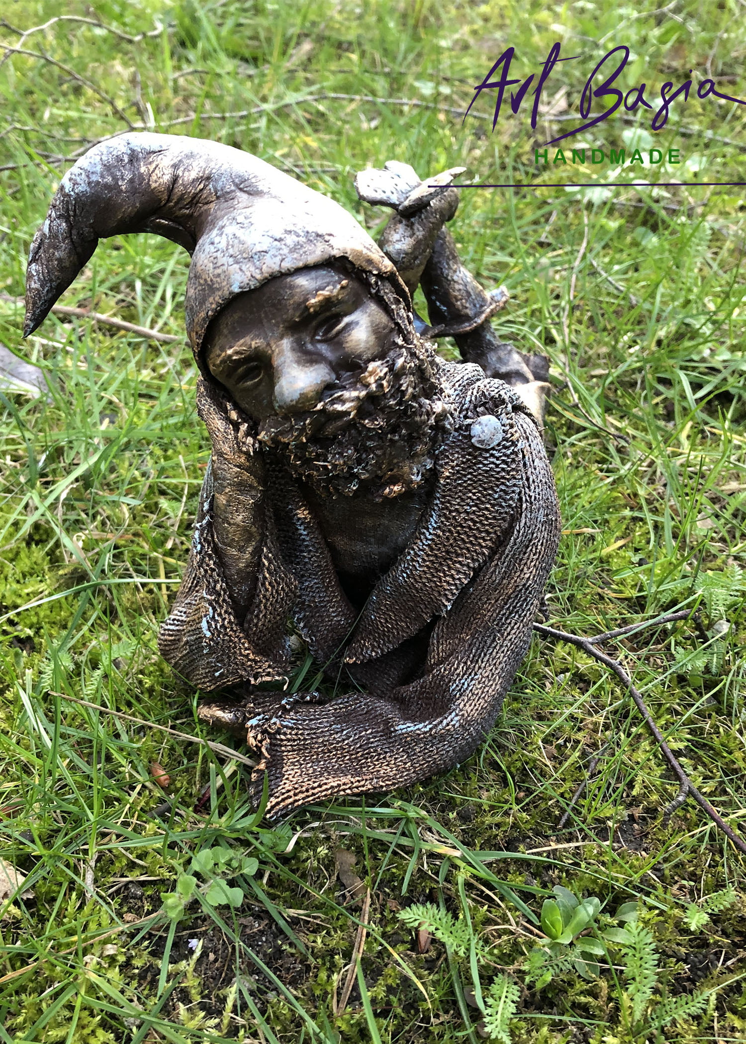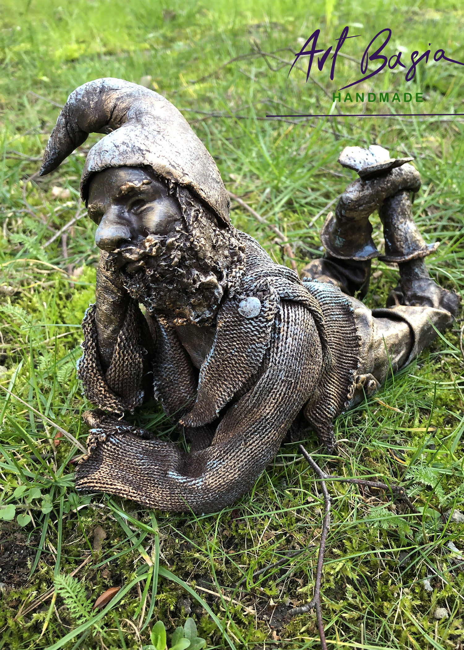 Dyzio to nie jest zwykły krasnal. To dzieło sztuki, które powstało na warsztacie, gdzie pod okiem doświadczonego artysty, krok po kroku, odkrywałam tajniki rzemiosła. Figurka, którą widzicie na zdjęciu, leży pochylony, zagłębiony w marzeniach lub zadumie, z jego charakterystyczną czapką spadającą lekko na bok, co dodaje mu zadumy i swobody. Jego broda i ubranie są wykonane z niezwykłą starannością, gdzie każdy warkocz brody, każda fałda szaty zdają się opowiadać własną historię.