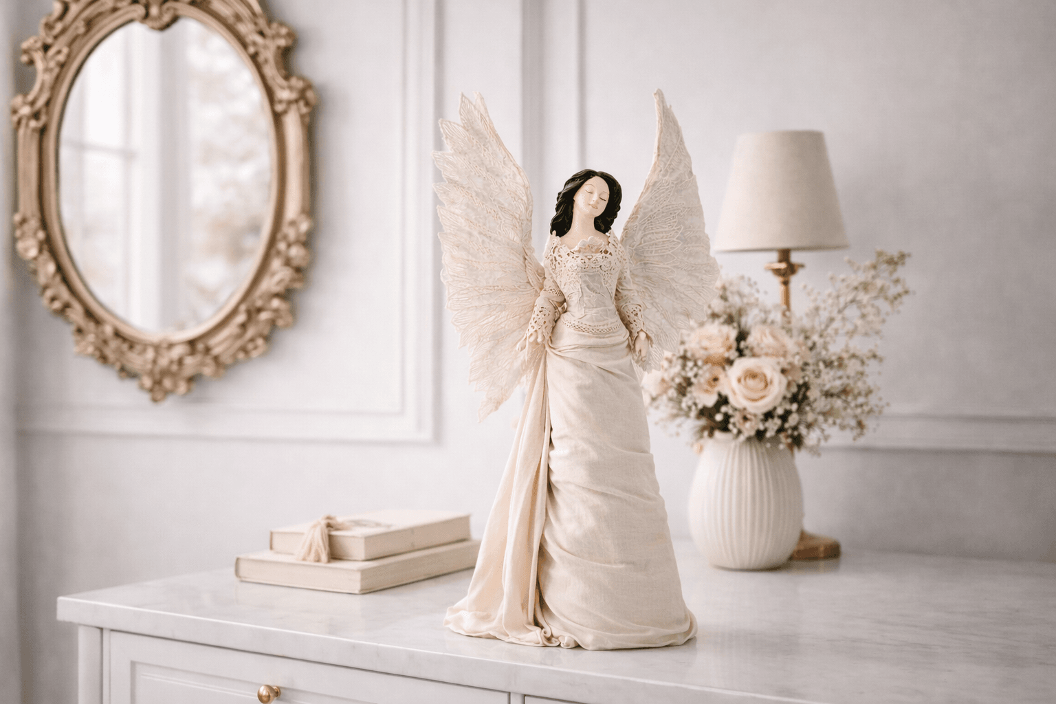 Pierwsza bombka z tej serii łączy w sobie delikatność kwiatów z wyrafinowaną kolorystyką. Górna część bombki ozdobiona jest motywem róż – klasycznym symbolem elegancji i piękna. Subtelne różowe róże na tle antycznej bieli nadają całości nostalgicznego, romantycznego charakteru. Dolna część bombki została pomalowana na delikatny niebieski odcień, z wykończeniem w formie ornamentów w stylu barokowym, co nadaje bombce królewskiego charakteru. Użycie techniki spękań (crackle) dodaje jej dodatkowej głębi i artystycznego wyrazu.