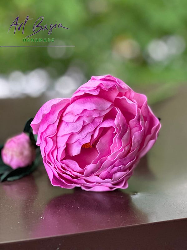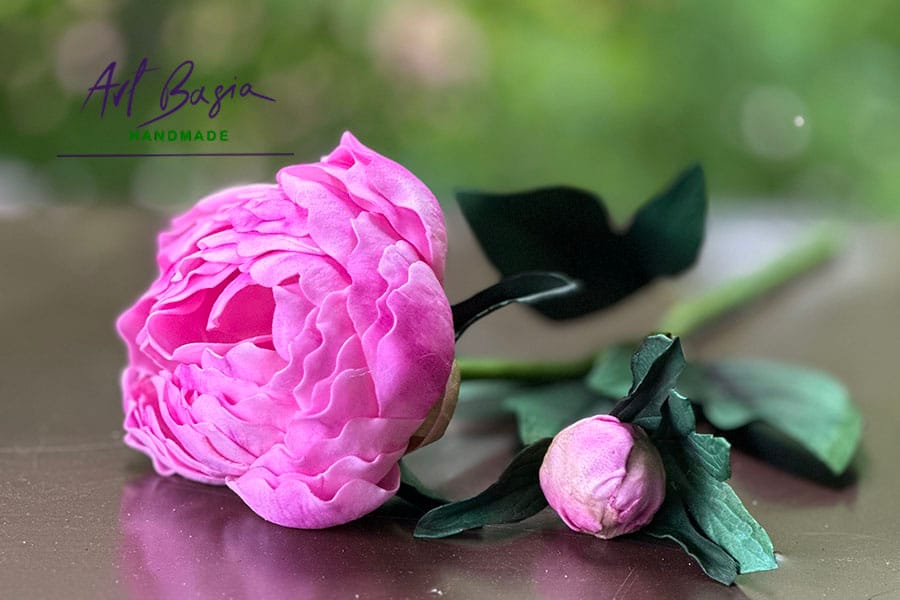 Ta peonia powstała z połączenia dwóch technik: foamiranu oraz zimnej porcelany. Obie materiały dają ogromne możliwości – pozwalają uzyskać realistyczny efekt i jednocześnie tworzyć coś trwałego, co nie zwiędnie po kilku dniach.