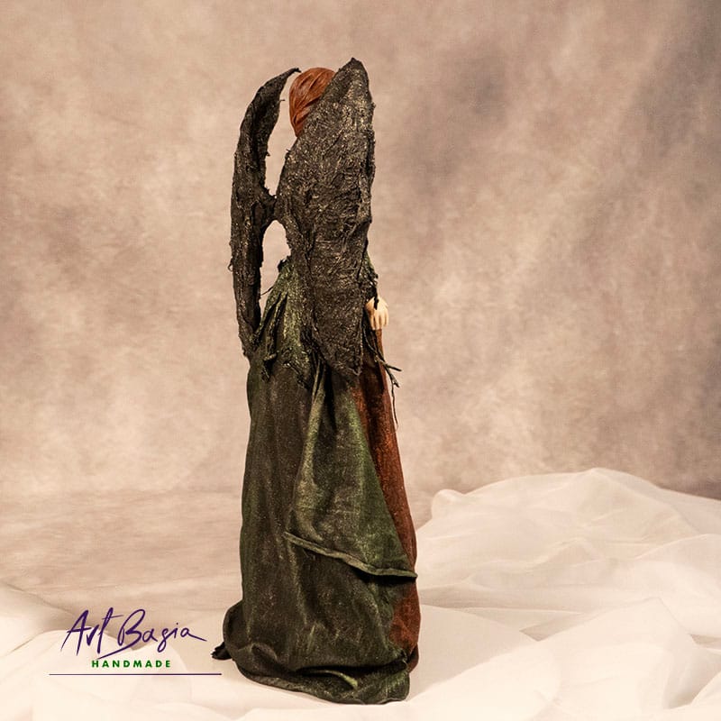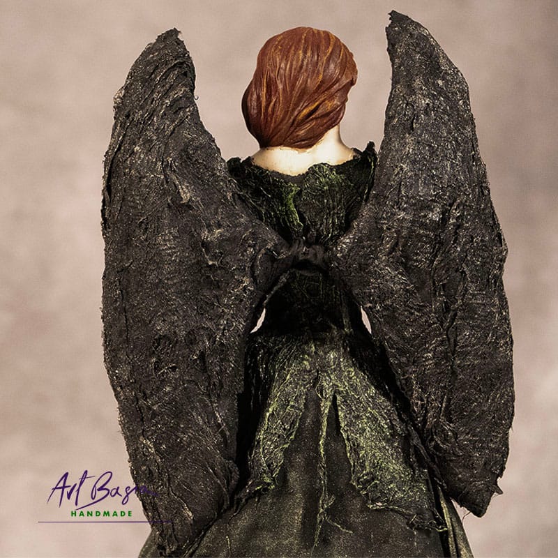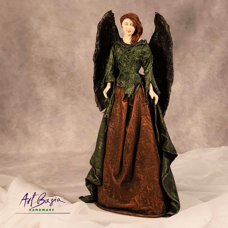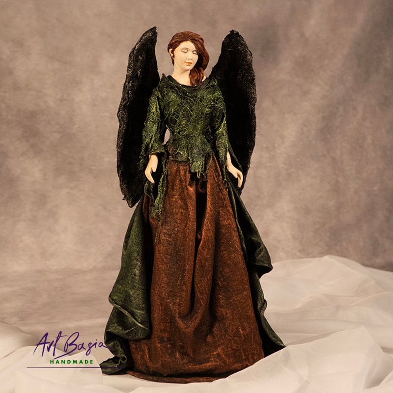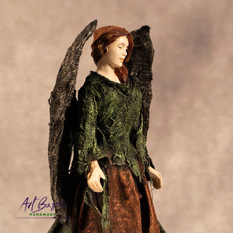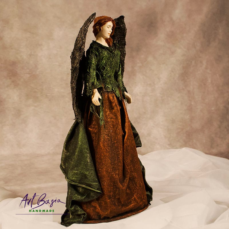 Jej suknia łączy głęboką zieleń i ciepłą miedź – kolory inspirowane naturą. Dekoracyjna figurka anioła do domuprzyciąga spojrzenia detalami: fakturą materiału, spokojnym wyrazem twarzy i charakterystycznymi, ciemnymi skrzydłami.