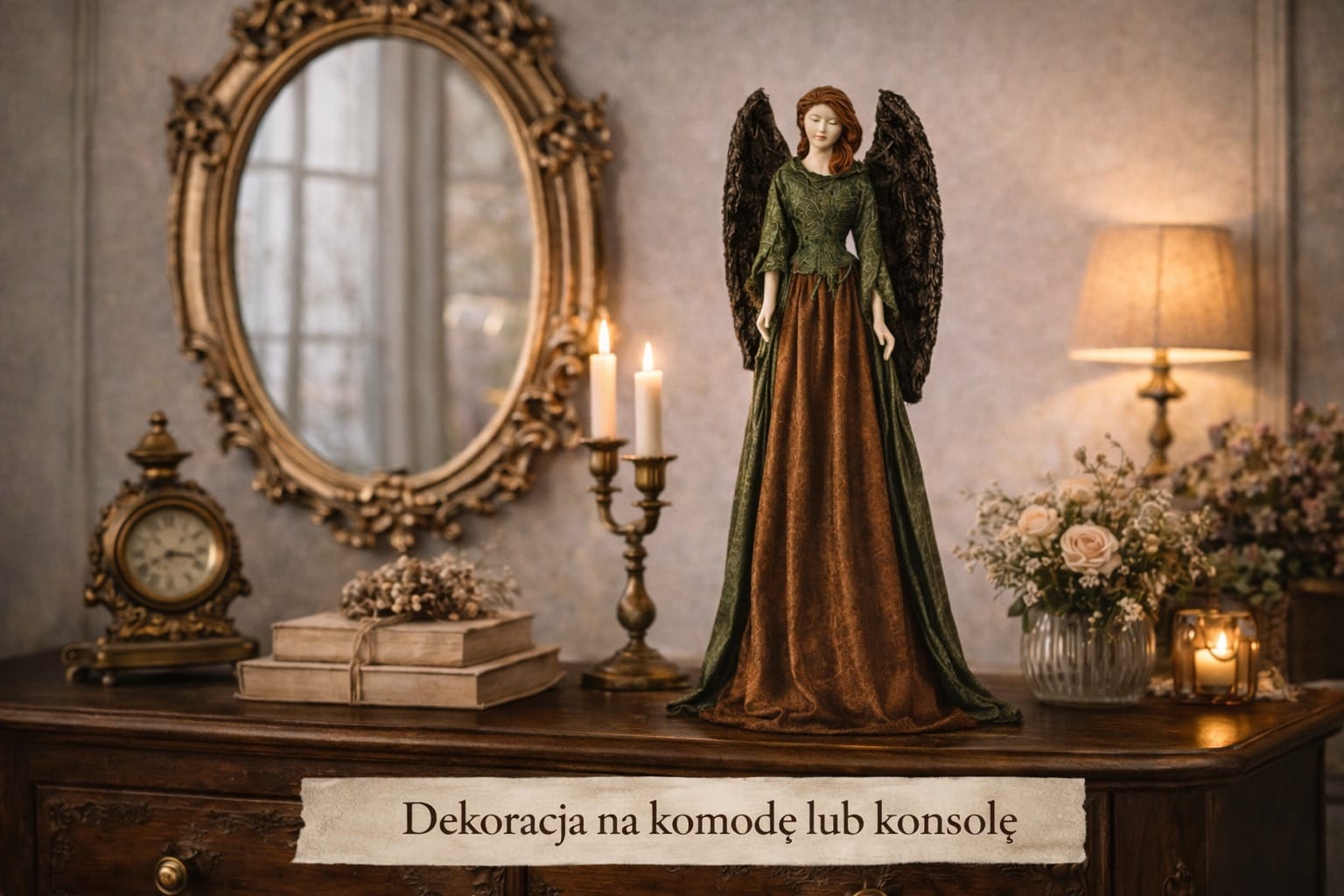 Smukła figurka anioła Rudzielec handmade w zielono-miedzianej sukni, ustawiona na stylowej komodzie w eleganckim wnętrzu vintage