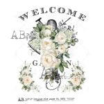 Kompozycja składa się z białych róż i delikatnych zielonych listków, ułożonych wokół napisu “WELCOME” w stylu vintage.