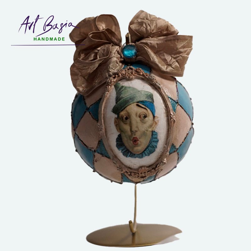 Do wykończenia użyłam techniki reliefowej, tworząc subtelne wypukłe elementy wokół motywu harlekina oraz na połączeniach malowanej kratki. Dzięki temu bombka zyskuje dodatkową fakturę i głębię.