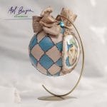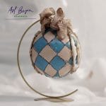 Kratka na powierzchni bombki została ręcznie namalowana farbami akrylowymi w odcieniach błękitu i beżu. Użycie pędzla do namalowania każdej linii wymagało precyzyjnej pracy i pewnej ręki, aby zachować równość i symetrię.
