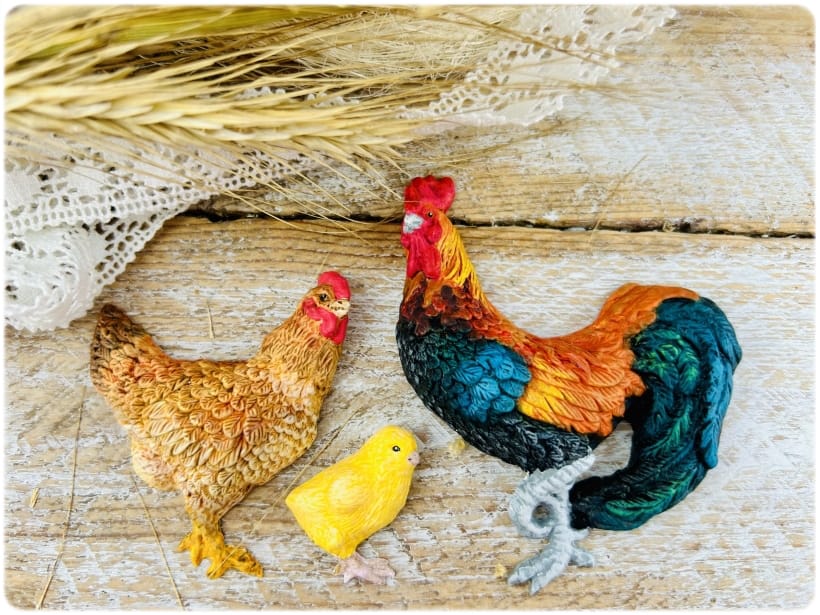 Dzięki realistycznie odwzorowanym szczegółom koguta, kury i kurczątka, forma doskonale sprawdzi się w dekoracjach wielkanocnych, rustykalnych aranżacjach oraz projektach folkowych.