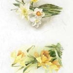 2. Bukiet żółtych narcyzów: Grupa jasnożółtych narcyzów z zielonymi liśćmi, tworząca harmonijną i pełną wdzięku kompozycję. Ten wzór znajduje się w dolnej części papieru, dodając świeżości i radosnego charakteru.