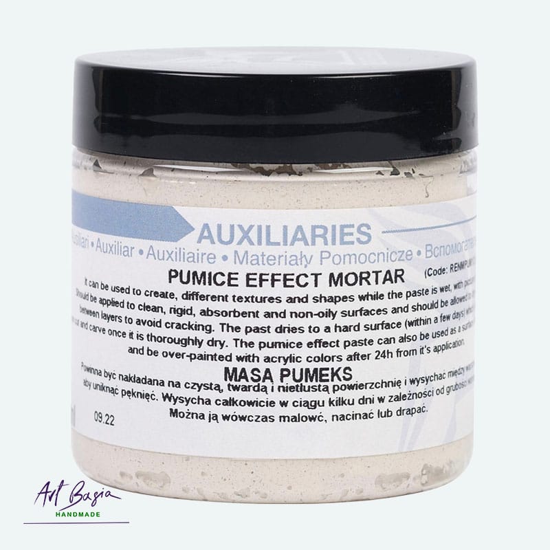 Profesjonalna pasta strukturalna akrylowa z charakterystycznym, surowym efektem pumeksu. Kremowa konsystencja pozwala na łatwe nakładanie szpachelką i budowanie naturalnie wyglądających faktur. Masa wysycha do postaci twardej, lekko porowatej powierzchni, którą można dalej obrabiać – malować, drapać, nacinać lub patynować.