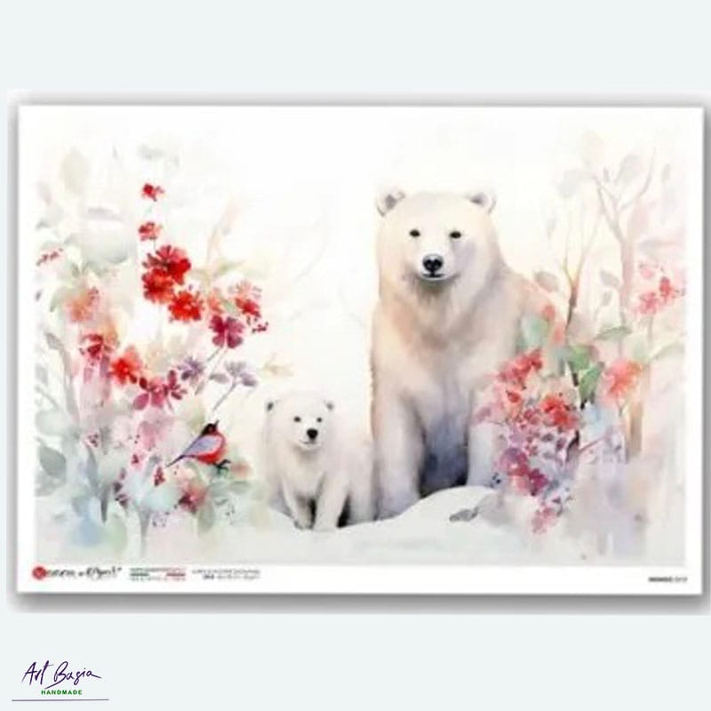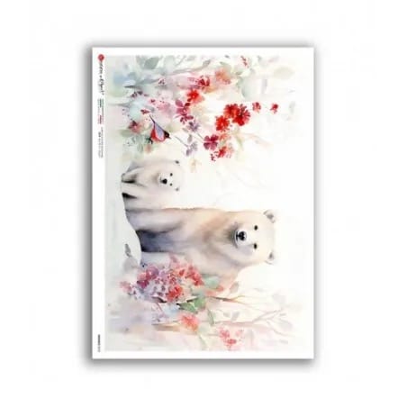 Papier ryżowy Paper Designs ZWIERZĘTA 0218 w formacie A4 przedstawia niedźwiedzicę polarną z młodym w otoczeniu barwnych kwiatów na tle zimowej scenerii. To wyjątkowy motyw, który sprawdzi się w technice decoupage przy tworzeniu eleganckich i oryginalnych dekoracji.