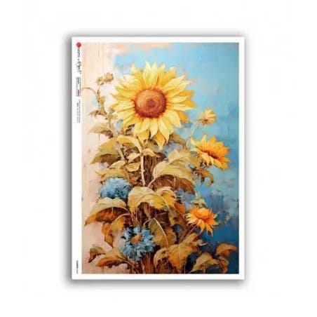 Papier ryżowy Paper Designs 0407 KWIATY w formacie A4 przedstawia piękne, żółte słoneczniki w malarskim stylu na tle błękitnego nieba. To wyjątkowy motyw dla miłośników decoupage, którzy pragną dodać swoim dekoracjom naturalnego i ciepłego charakteru.