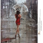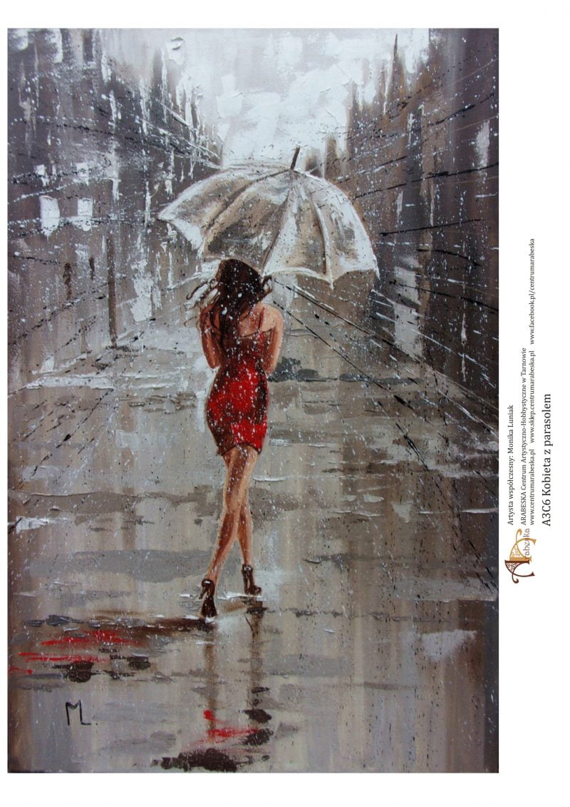 Centralny motyw przedstawia kobietę w czerwonej sukience, idącą po mokrej ulicy z przezroczystą parasolką. Scena ukazuje dynamiczny ruch i ulotny moment w deszczowej aurze.