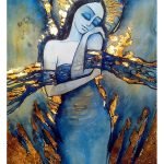 Obraz przedstawia anioła z niebieskimi skrzydłami, ujętego w spokojnej, zamyślonej pozie.
