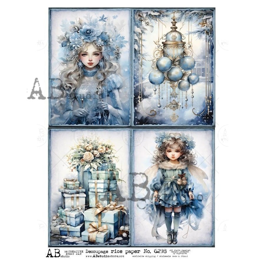 Grafika utrzymana jest w chłodnej, eleganckiej palecie zimowych błękitów oraz pastelowych odcieni. W skład ilustracji wchodzą: dziewczynka w stylu vintage/fantasy, zimowe prezenty, dekoracyjne bombki, kwiatowe kompozycje oraz elementy świąteczno-winterowe. Motyw nadaje pracom efekt baśniowej, subtelnie magicznej dekoracji.