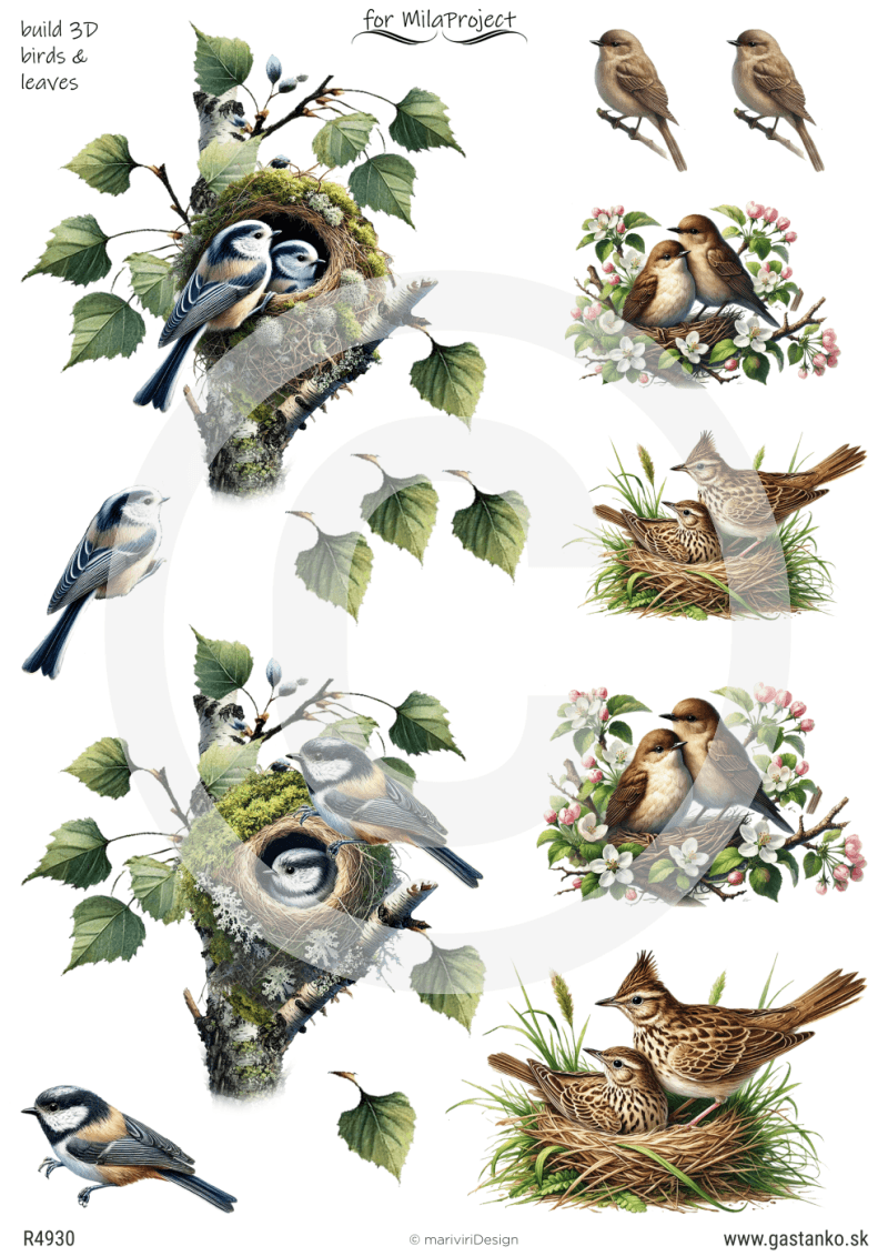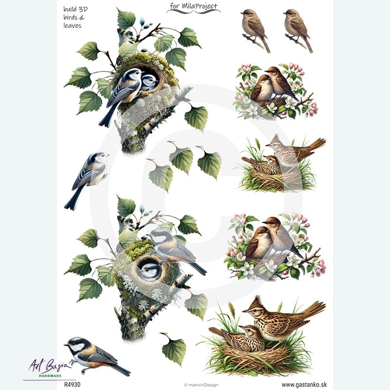 Papier ryżowy MariviriDesign R4930 Ptaszki i gniazda R4930 to wyjątkowy wzór inspirowany naturą, przedstawiający ptaki wśród liści i gniazd.