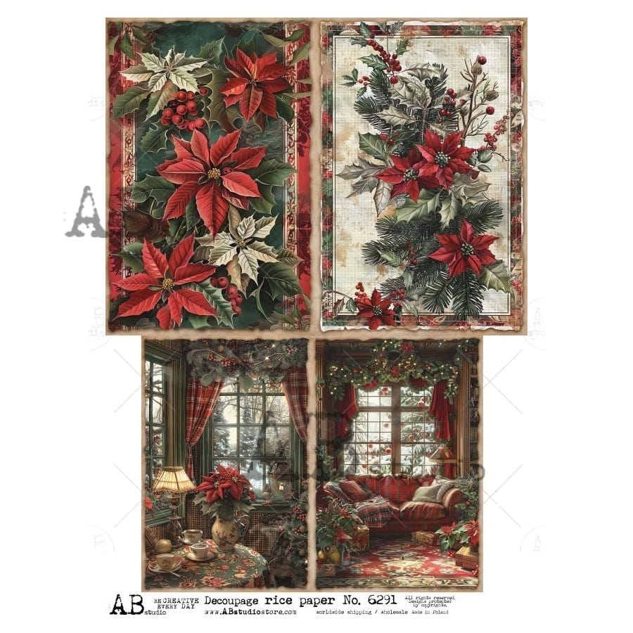 Grafika przedstawia cztery bogate, świąteczne kompozycje w stylu vintage, utrzymane w ciepłej kolorystyce czerwieni, zieleni i beżu. Motywy obejmują: