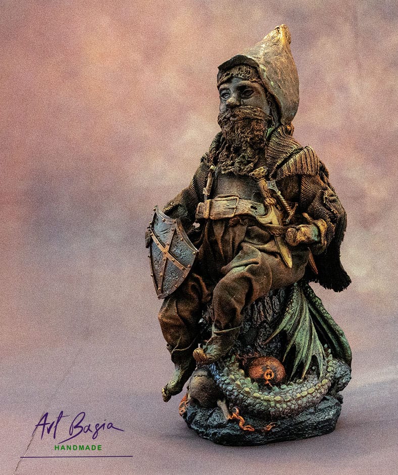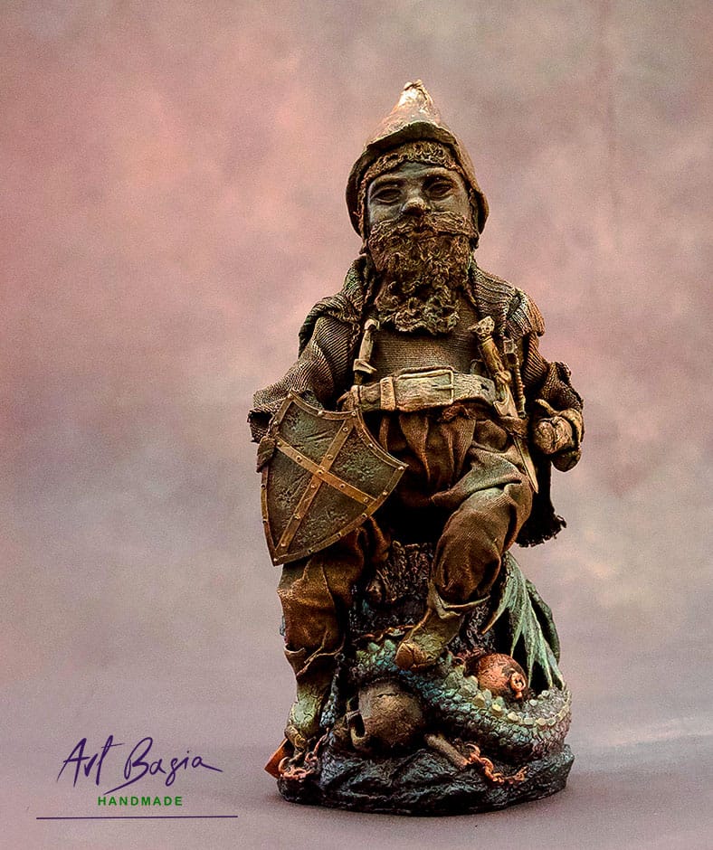 Ta figurka powstała jako mała opowieść zamknięta w formie rzeźby. Krasnal został wykonany techniką utwardzania tkanin, dzięki czemu jego ubranie ma naturalne, miękkie fałdy i fakturę prawdziwego materiału. Pod nim znajduje się gipsowy odlew smoka, który tworzy podstawę całej kompozycji.