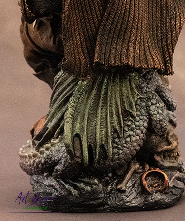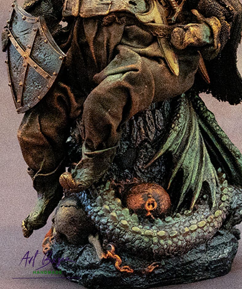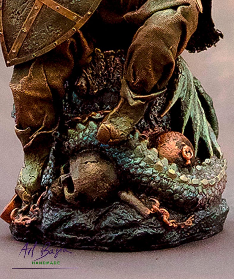 Choć sama figurka nie jest duża – całość ma około 30 cm wysokości – kryje w sobie wiele detali: łuski smoka, fragmenty skarbu, czaszkę dawnego śmiałka, stare monety i elementy zbroi.