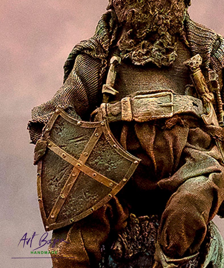 Siedzi spokojnie na grzbiecie uśpionego smoka, jakby pilnował, by żaden nieostrożny krok nie zakłócił pradawnej równowagi. W jednej dłoni trzyma tarczę, w drugiej spoczywa gotowa do użycia broń. Bo choć cisza panuje w komnacie skarbu, strażnik nigdy nie zasypia naprawdę..
